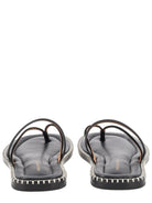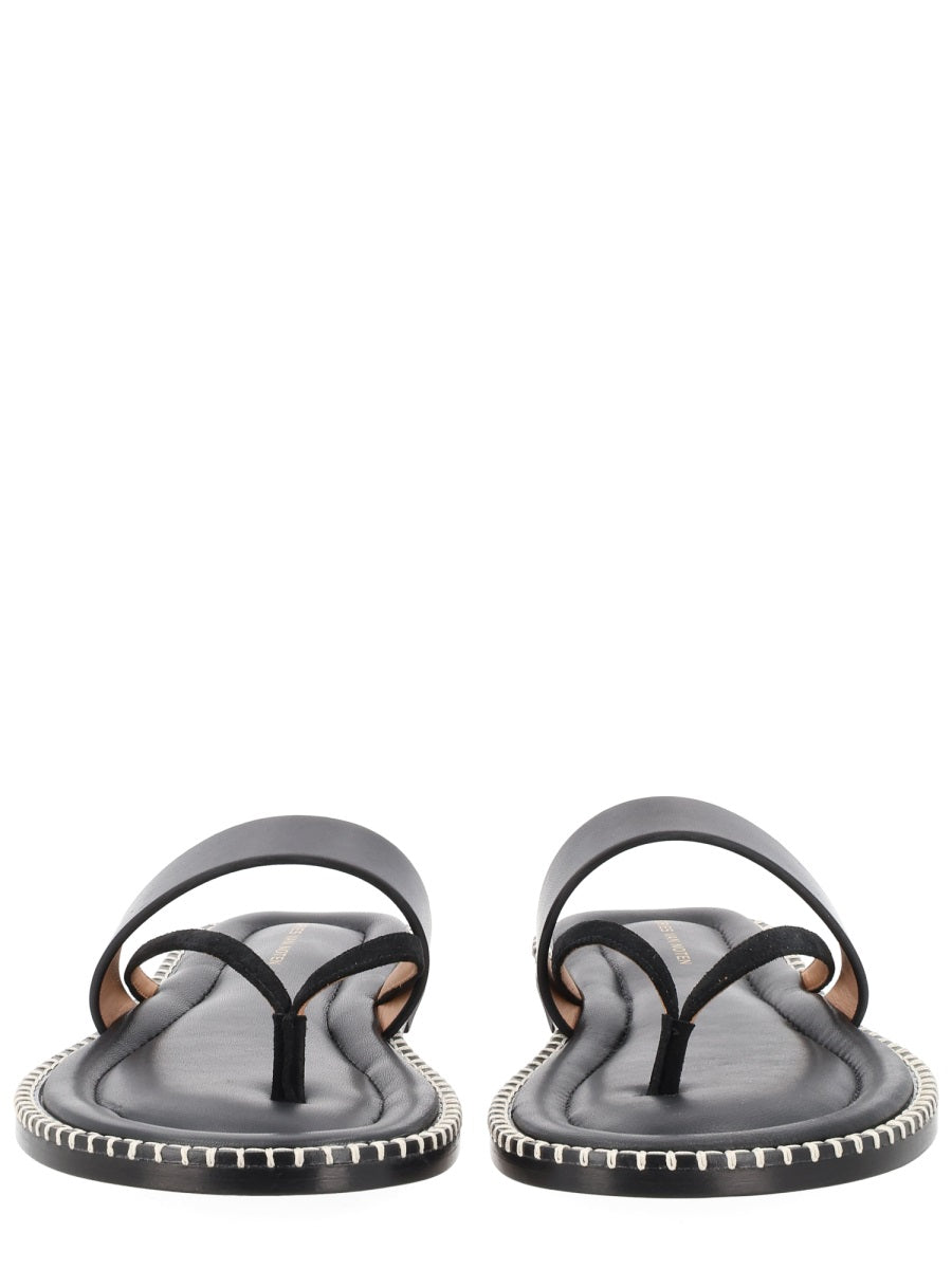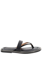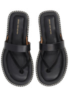 Elevate your warm-weather wardrobe with these sophisticated black leather sandals from Dries Van Noten. Crafted from 100% premium leather in Italy, these slide sandals feature a sleek thong design with a wide strap detail and distinctive contrast stitching along the sole.