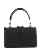 This luxurious mini bag features premium black leather construction with intricate braided detailing along the edges and handle, creating a sophisticated textural contrast. The signature silver swallow logo clasp adds Pinko's distinctive touch of elegance and serves as the focal point of this exquisite accessory.