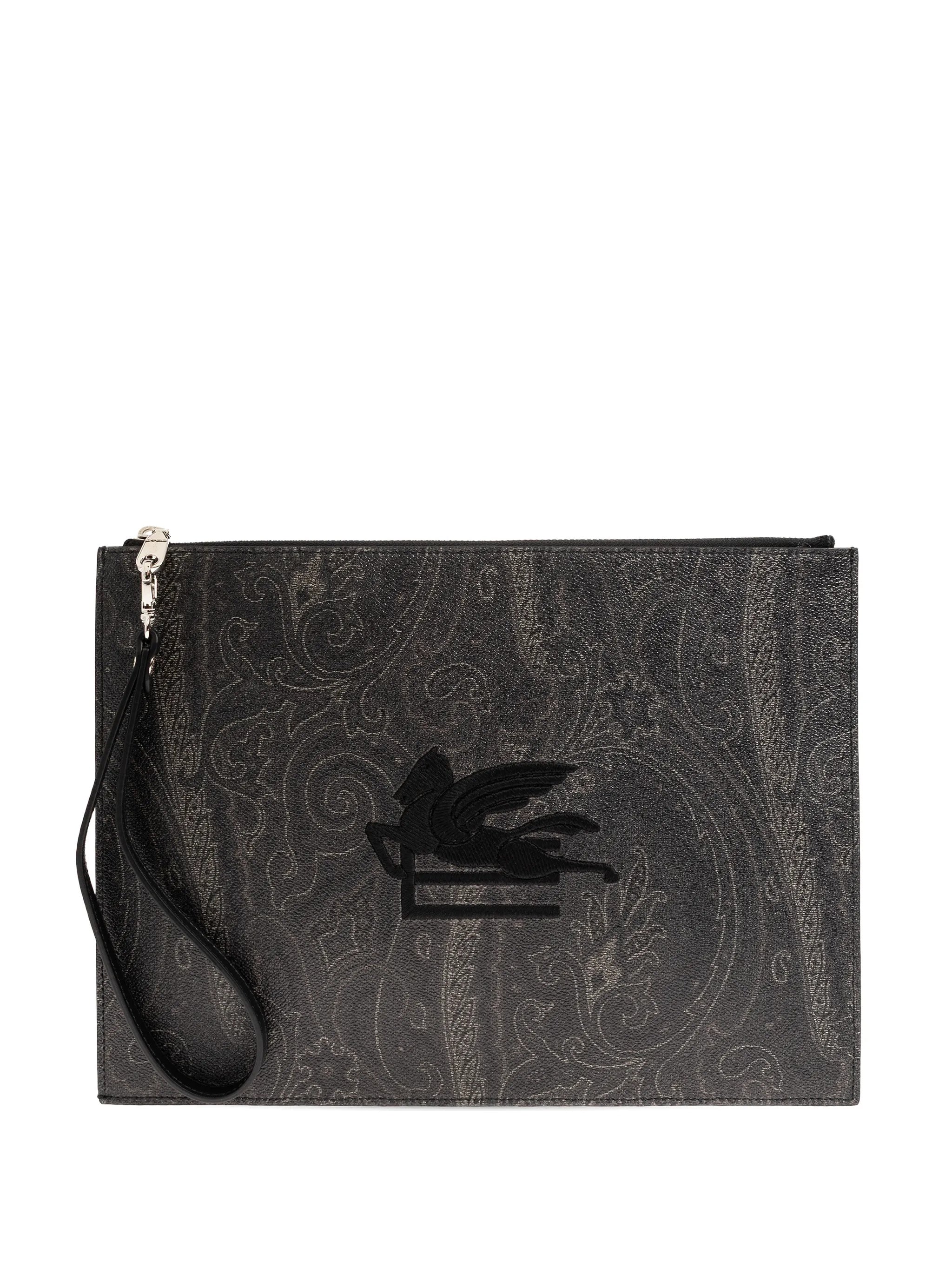 Elevate your accessory collection with this sophisticated black leather pouch from Etro, featuring the brand's iconic paisley pattern in a subtle tonal design.