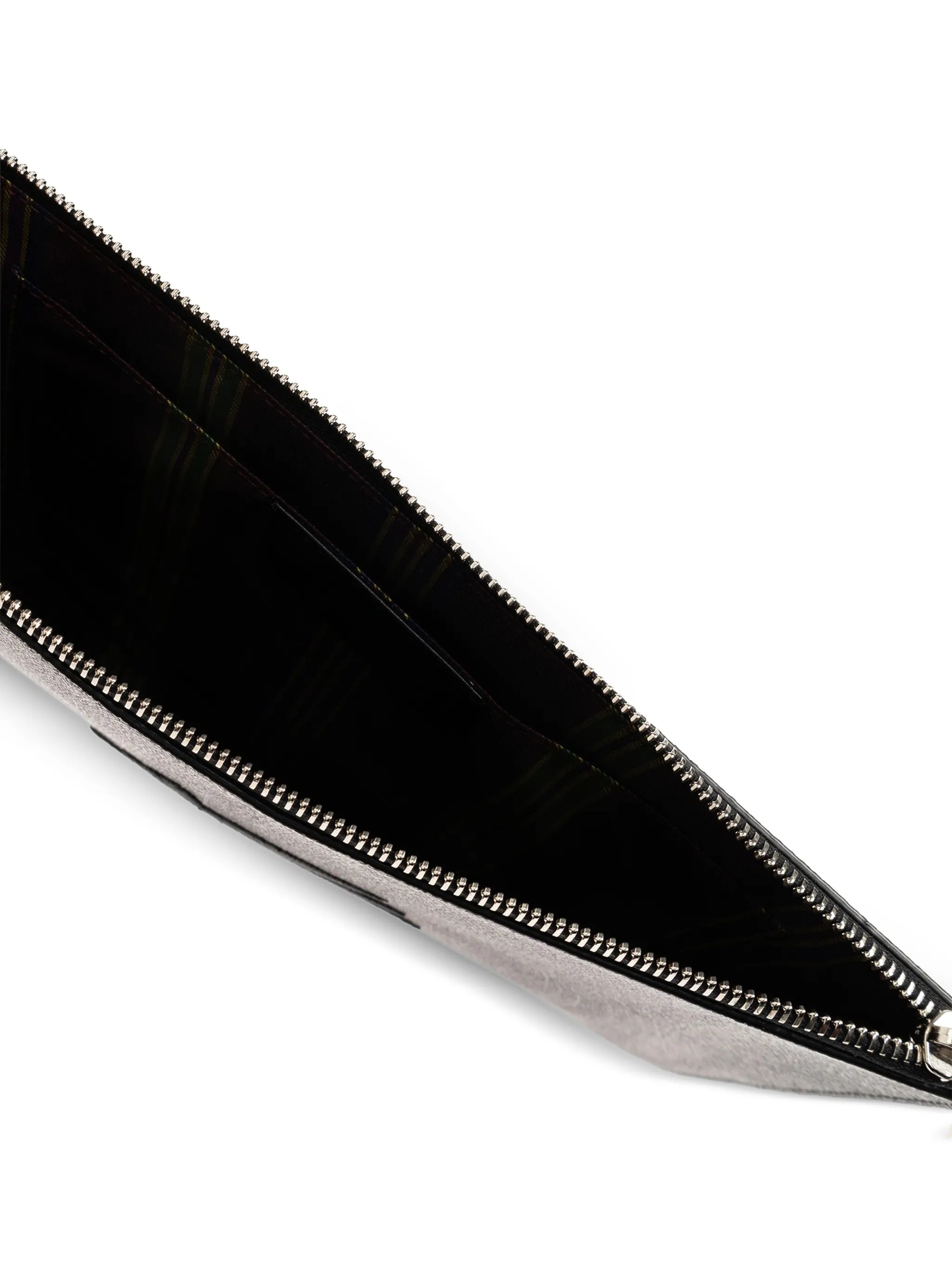 This versatile small leather goods piece combines Italian craftsmanship with practical functionality, complete with a convenient wrist strap and secure zip-top closure.