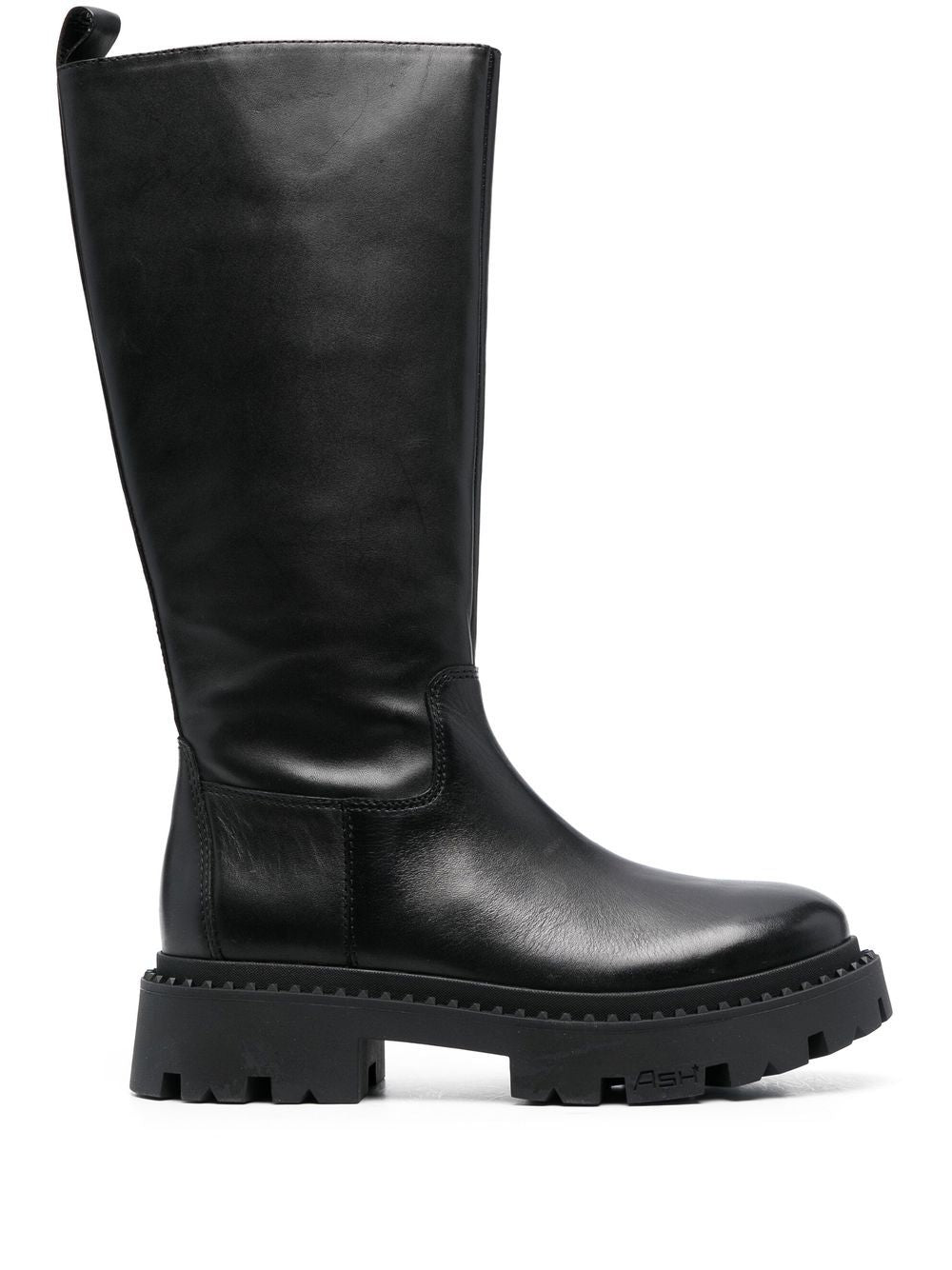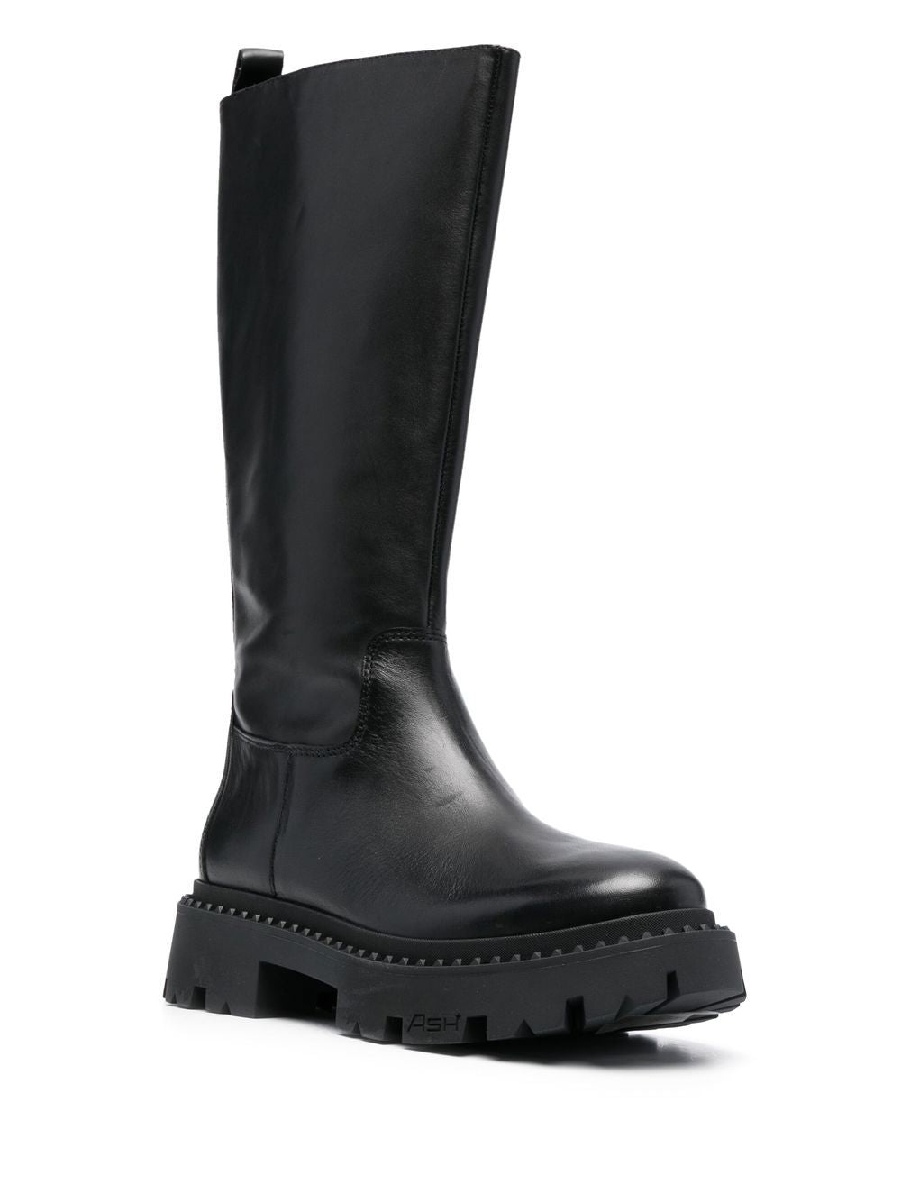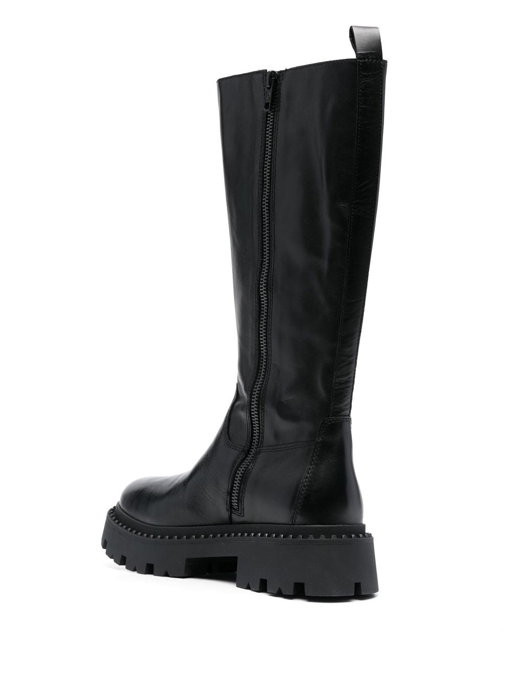 BLACK CALF LEATHER ALMOND TOE SIDE ZIP FASTENING KNEE-LENGTH RIDGED RUBBER SOLE MID BLOCK HEEL