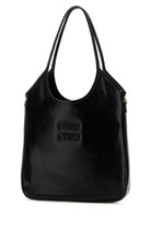 Elevate your everyday style with this luxurious Black Leather Shopping Bag from Miu Miu. Crafted from supple black leather, this sophisticated tote features comfortable shoulder straps and the iconic Miu Miu logo embossed on the front.