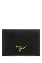 Elevate your everyday essentials with this sophisticated black leather wallet from Prada. Crafted from luxurious Saffiano leather with the iconic crosshatch texture, this compact wallet features the signature triangular logo plaque in gleaming gold-tone hardware.