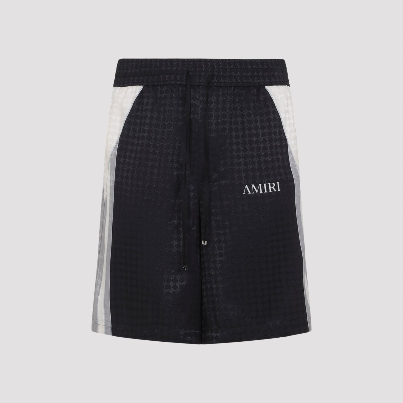 Crafted from pure viscose fabric, these shorts feature an elastic waist with tonal drawstring fastening for ultimate comfort and adjustability. The distinctive quad panel design showcases contrasting white and grey sidebands with AMIRI's signature lettering logo, while an all-over pattern logo adds subtle brand recognition.