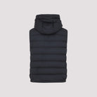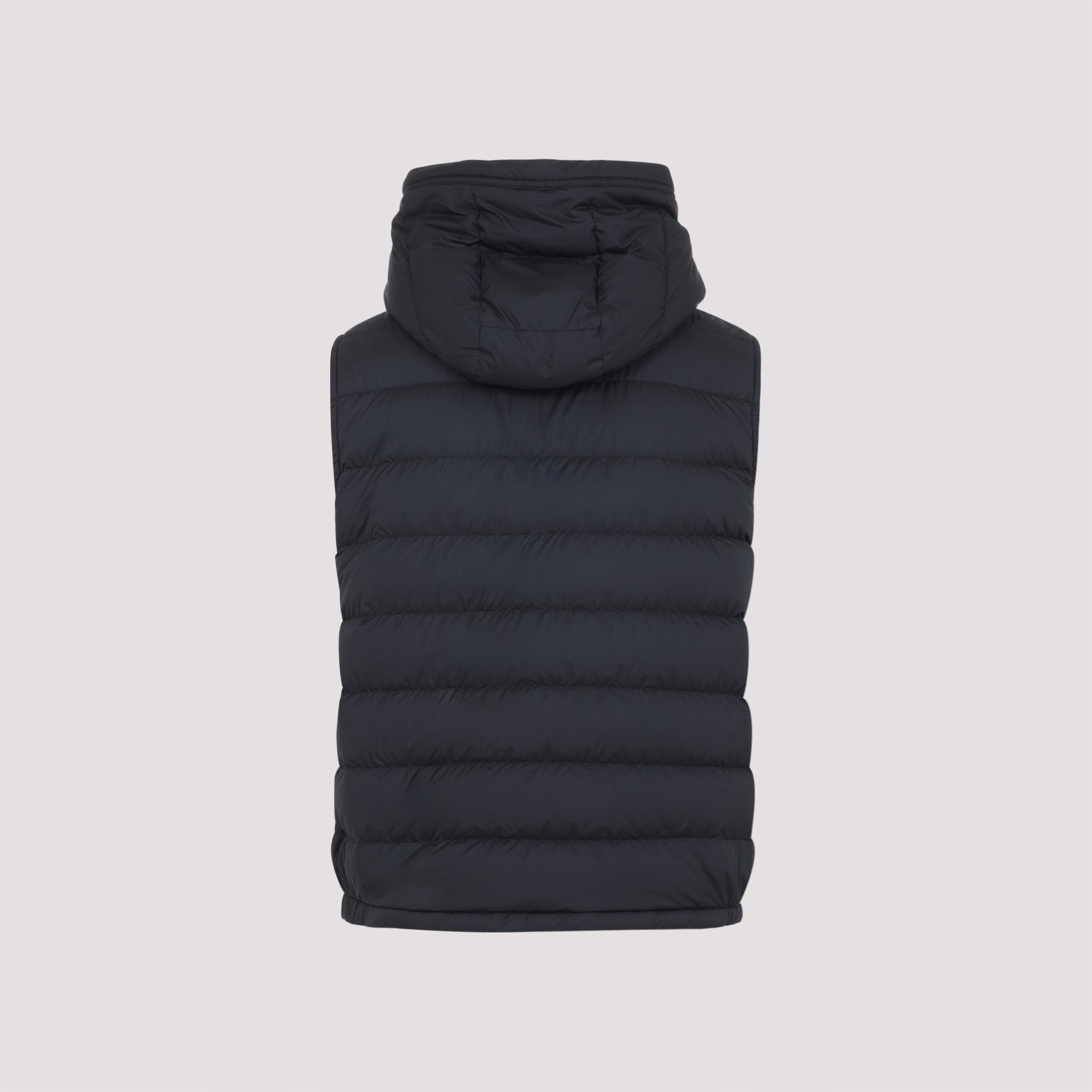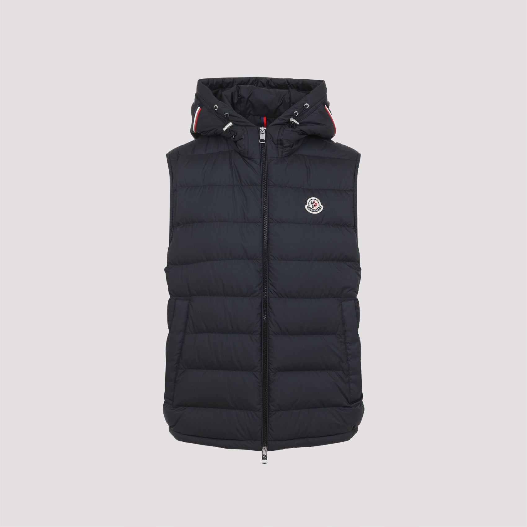 MONCLER BLACK MARSEILLAN VEST. CRAFTED IN POLYESTER FABRIC. TONAL HOOD, FRONT TONAL DRAWSTRING DETAILS, FRONT ZIPPED FASTENING, CHEST PATCH LOGO, SIDE POCKETS, SLEEVELESS, STRAIGHT HEM, PADDED DESIGN. BLUE, WHITE AND RED STRIPES ON THE SIDE OF THE HOOD.
