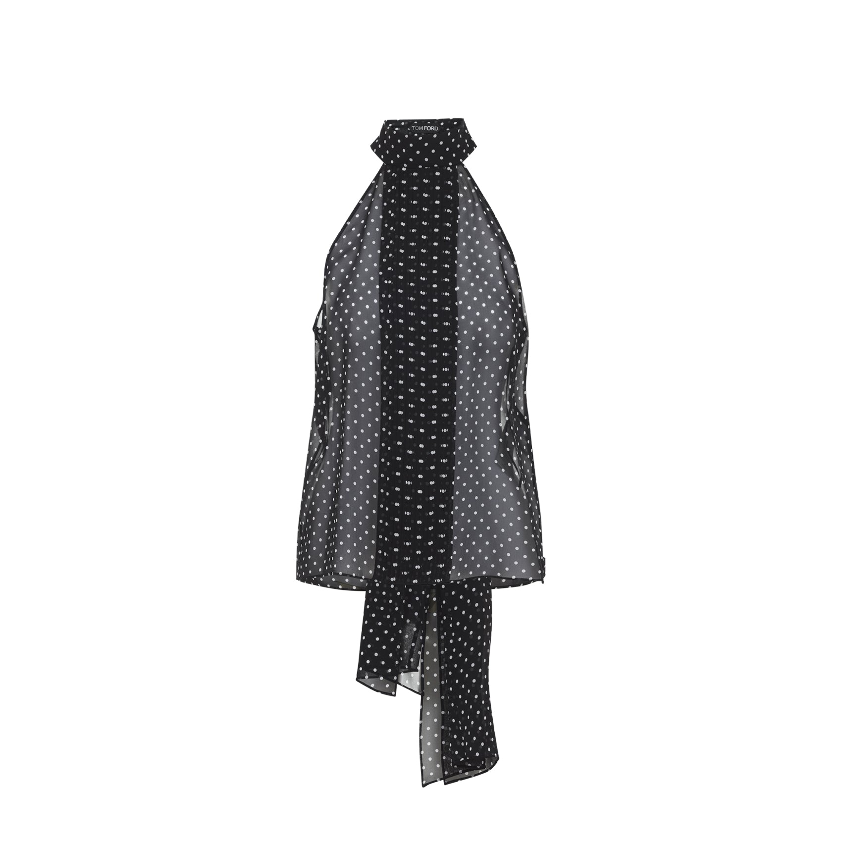 TOM FORD POLKA DOT BLACK SILK TOP. A LAVALLIER TOP CRAFTED FROM SEMI-SHEER PURE BLACK SILK WITH AN ALL-OVER POLKA-DOT PATTERN. IT FEATURES A STANDING COLLAR, A PLEATED PLASTRON ON THE FRONT, AND A SLIGHTLY FLARED HEM.