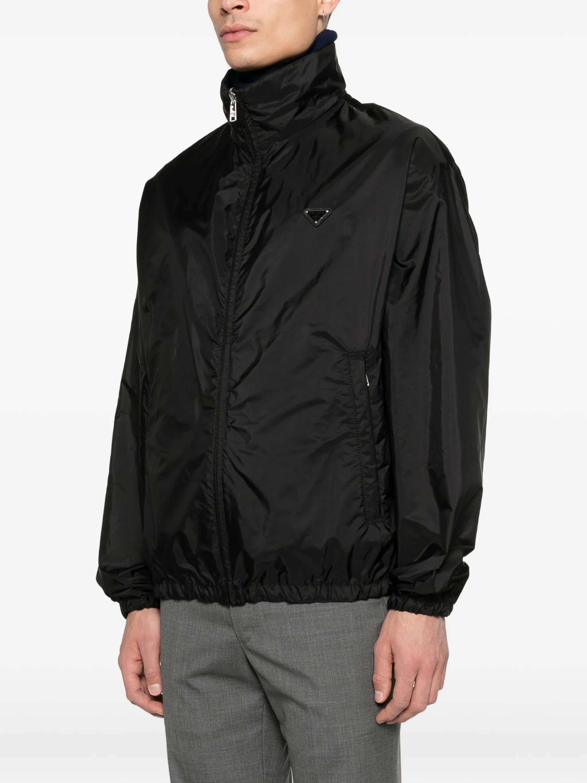 Elevate your outerwear collection with this sleek black polyamide jacket from Prada. This lightweight anorak features a full-zip front closure, stand collar, and signature triangle logo, embodying the perfect blend of Italian luxury and sporty functionality.