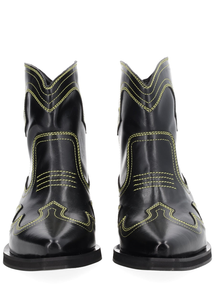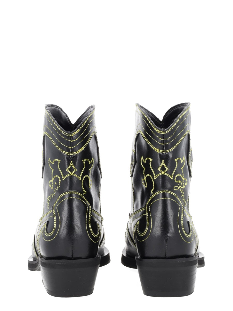 Elevate your footwear collection with these striking black polyurethane boots from Ganni. Featuring distinctive contrast stitching in gold and white tones, these boots showcase a Western-inspired aesthetic with decorative curved detailing that adds visual interest to any outfit.