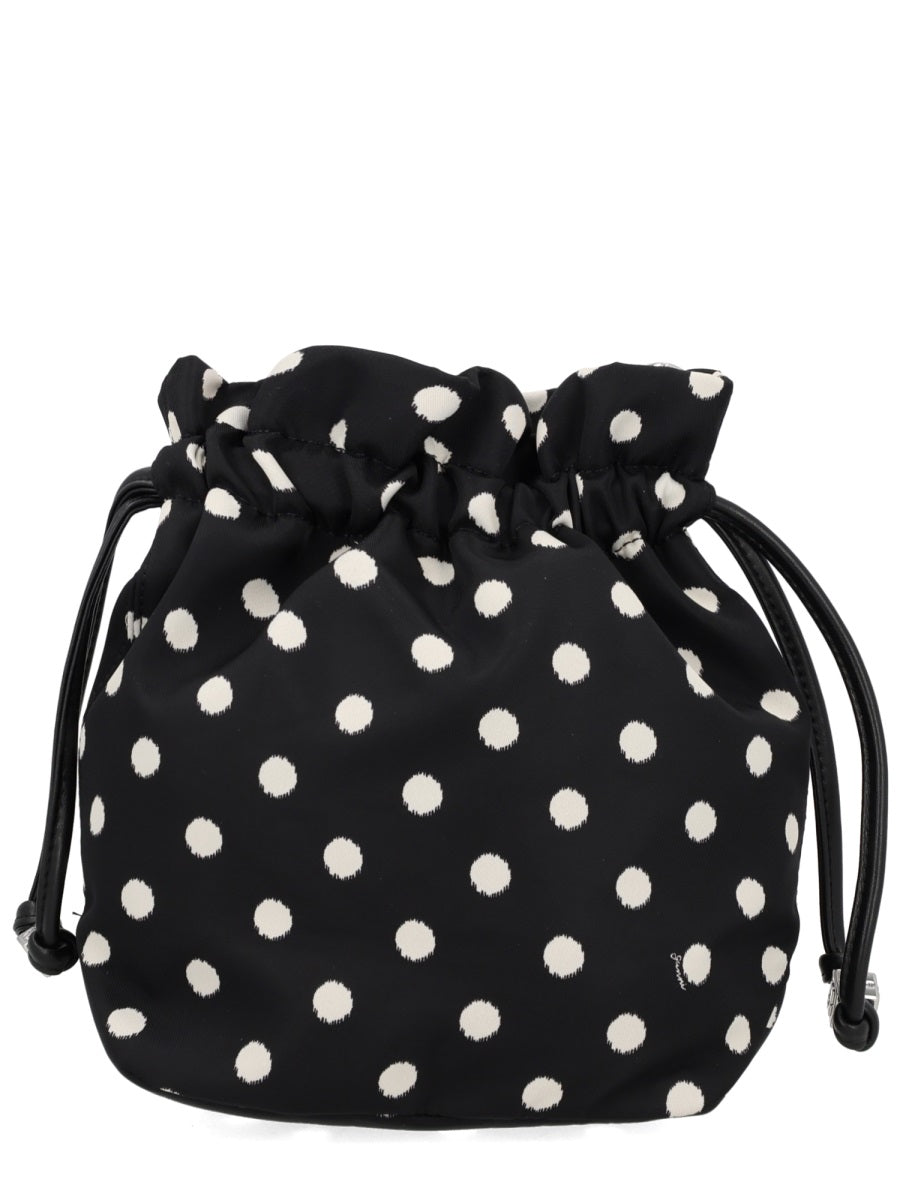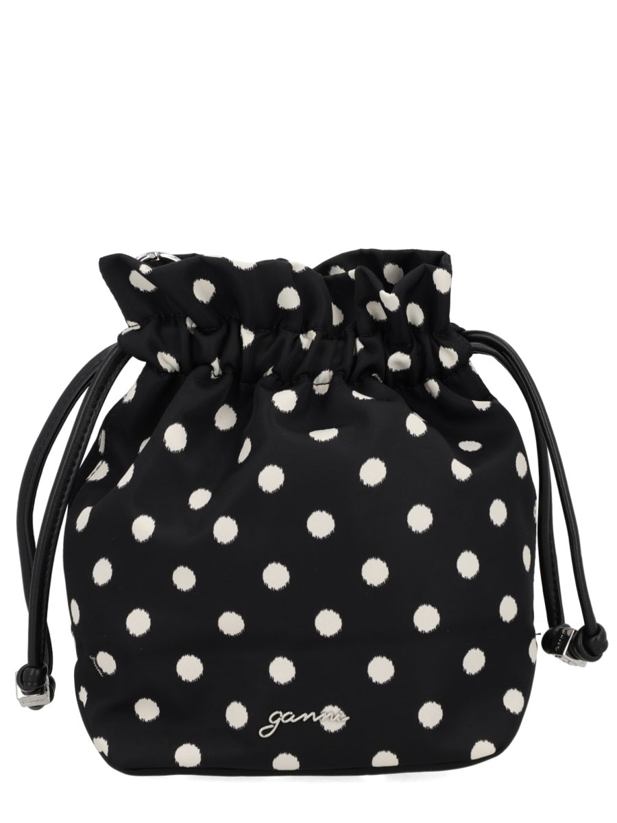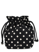 Elevate your accessory collection with this charming drawstring handbag from Ganni. Crafted from 100% recycled nylon, this eco-conscious piece features a playful polka dot pattern in classic black and white that adds a touch of whimsy to any ensemble.