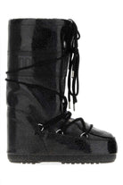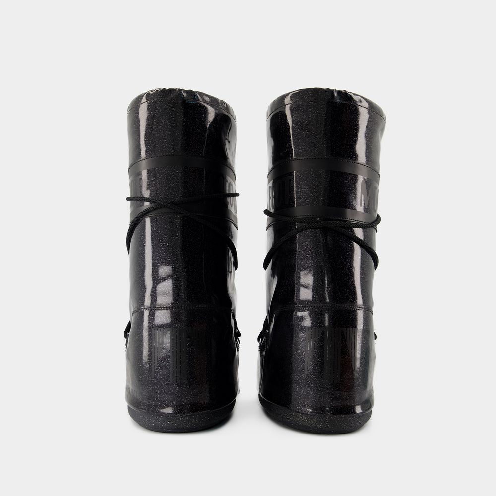 Step into winter wonderland with these iconic Moon Boot black rubber boots featuring glamorous glitter accents. These statement cold-weather boots combine functionality with high-fashion appeal, perfect for snowy adventures or making a bold style statement in the city.