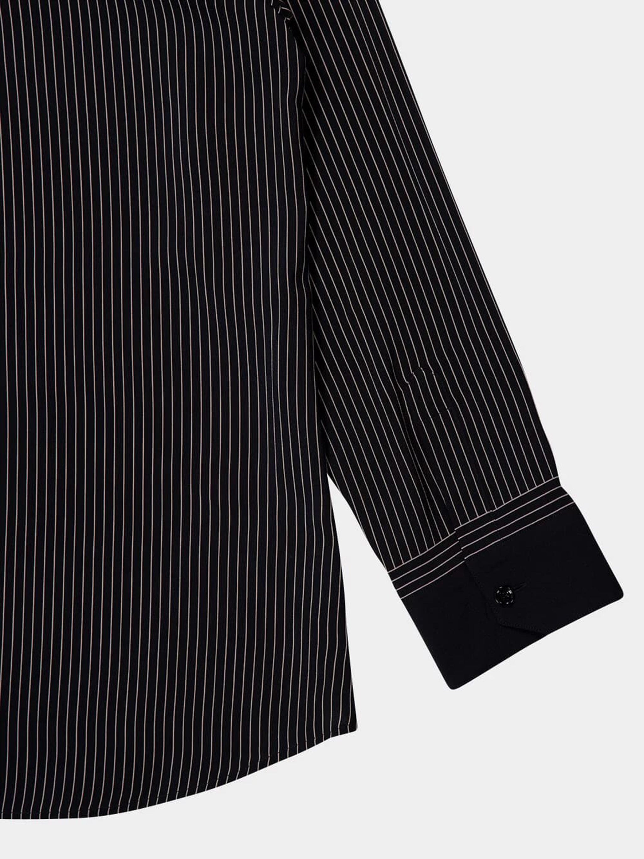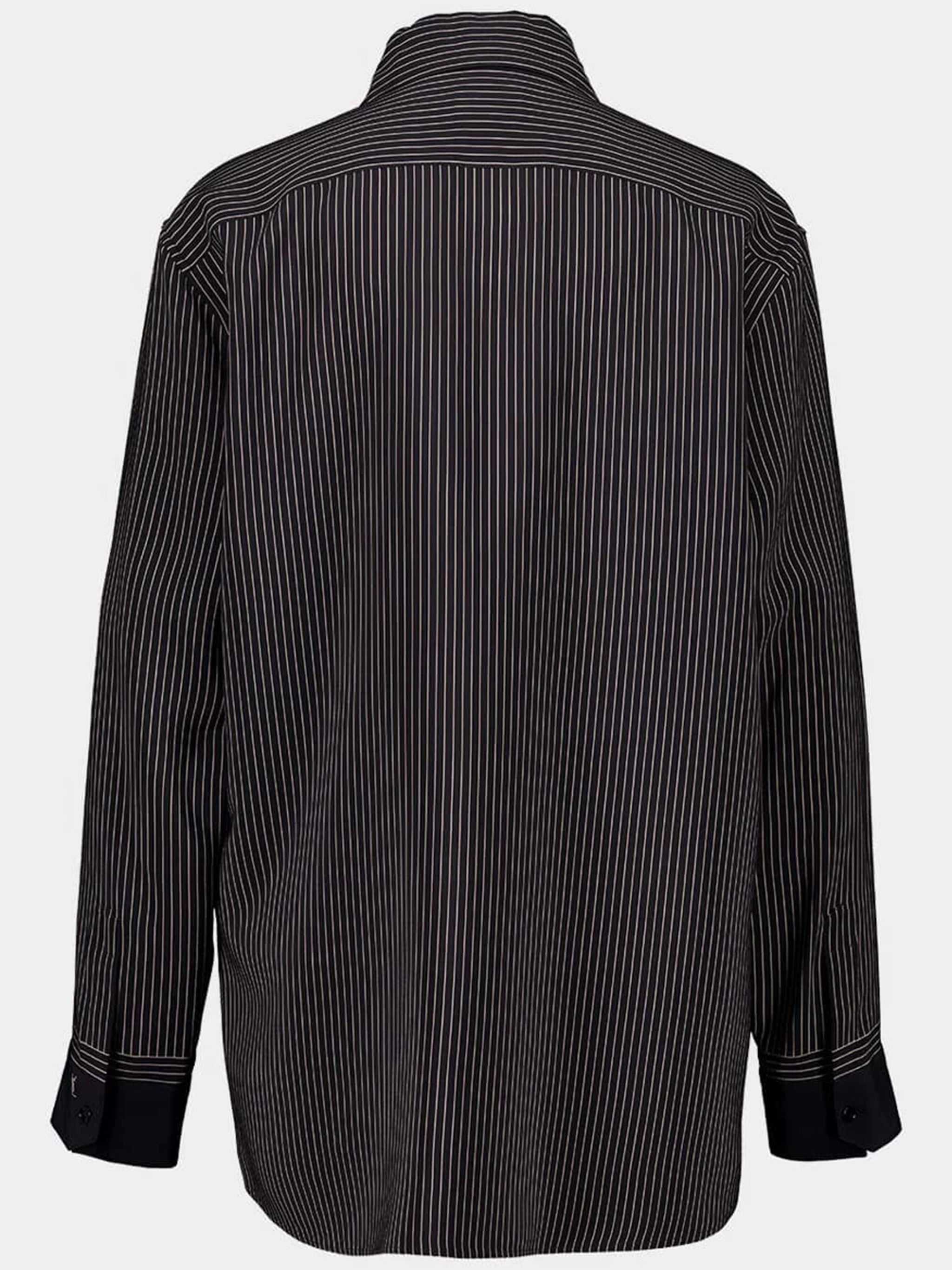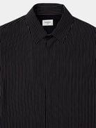 Elevate your wardrobe with this sophisticated Saint Laurent black silk printed stripe button-down shirt. Crafted from luxurious silk, this timeless piece features classic vertical pinstripes that create an elongating, flattering silhouette.