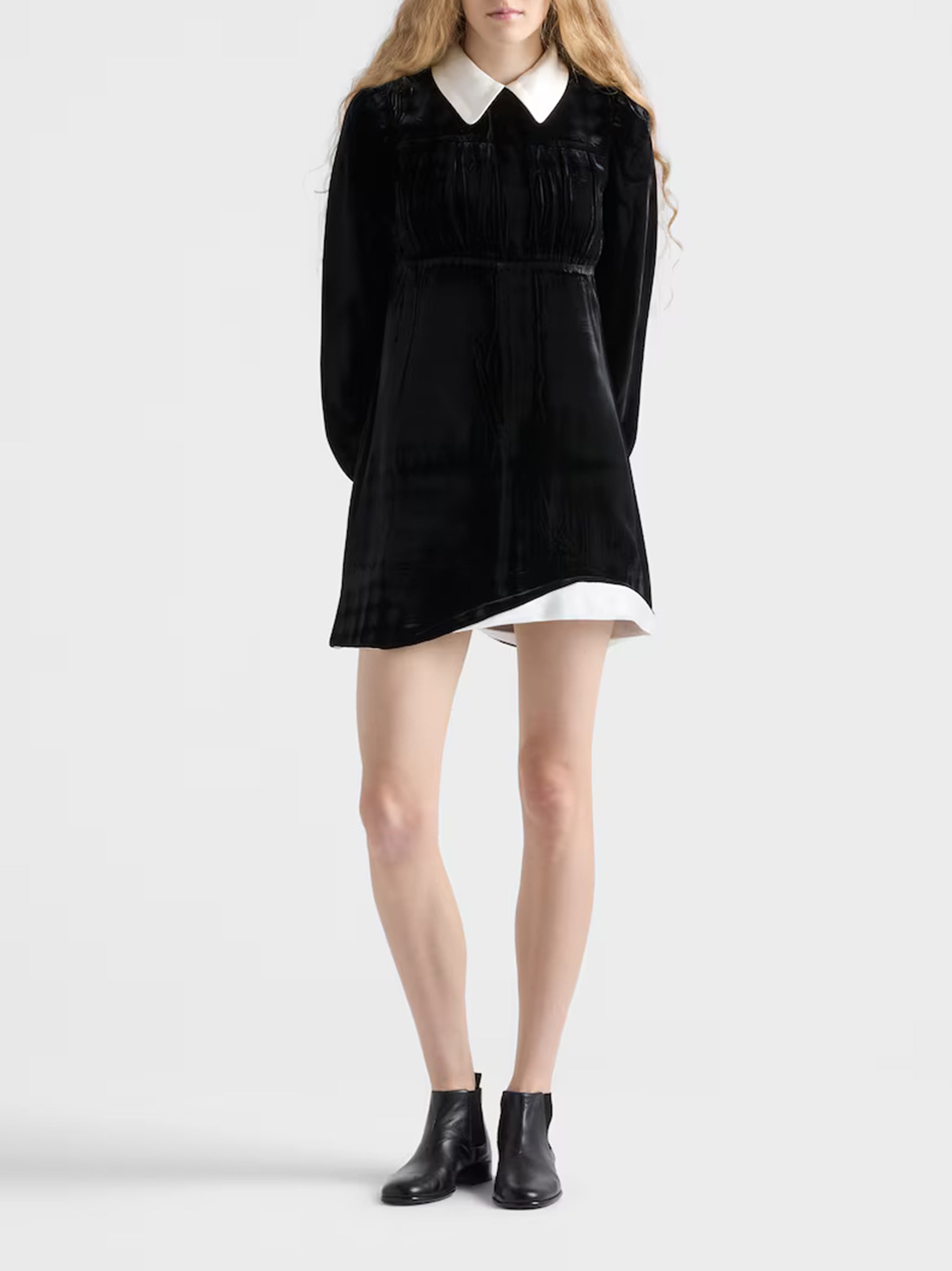 Elevate your wardrobe with this sophisticated Prada Black Viscose Cupro Dress. Crafted from luxurious viscose cupro fabric with a rich, velvet-like texture, this elegant dress features a striking contrast white collar that adds a refined, polished touch.