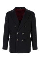Elevate your tailored wardrobe with this sophisticated black wool blend blazer from Brunello Cucinelli. This double-breasted design features classic notched lapels, a structured silhouette, and a luxurious burgundy lining that adds a refined touch of color.
