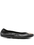 Elevate your everyday style with these elegant Tory Burch ballet flats in luxurious black leather. Featuring a signature gold-tone logo embellishment at the toe, these timeless flats combine sophistication with effortless comfort.