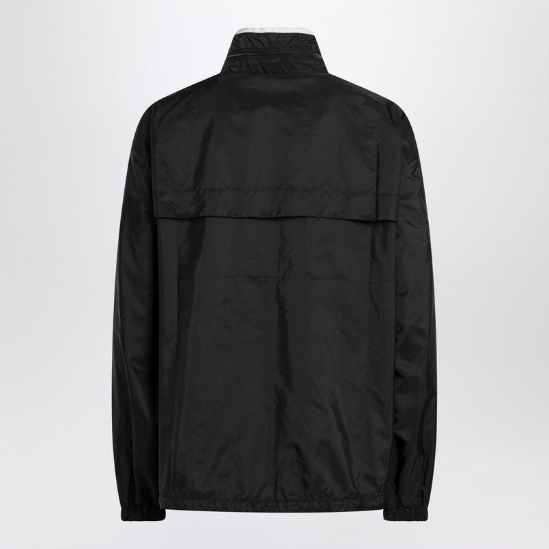 Prada elevates the classic blouson silhouette with this sophisticated Re-Nylon zip jacket in timeless black. Featuring elegant vanilla contrast piping and the iconic enamelled metal triangle logo on the chest, this piece seamlessly blends sporty functionality with luxury craftsmanship.