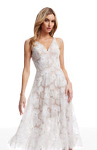 Sleeveless v neck fit and flare midi dress.