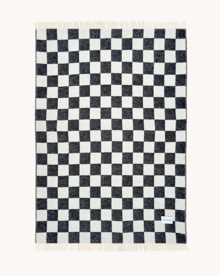 The CHECKERBOARD Blanket is jacquard-woven from 100% New Zealand wool with fringes on the short sides. A thick and super-soft blanket that is mirror-inverted on the opposite side. The reversible pattern allows you to swap between two different moods. Measuring 4.3 x 6.6 ft, it's big enough to keep two warm. An instant upgrade to the living room.
