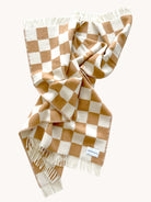 The Checkerboard Blanket Terra White is jacquard-woven from 100% New Zealand wool with fringes on the short sides. A thick premium blanket that is mirror-inverted on the opposite side. Measuring 130 x 200 cm, it's big enough to let someone join you. It keeps you warm and upgrades your living room in a split second.