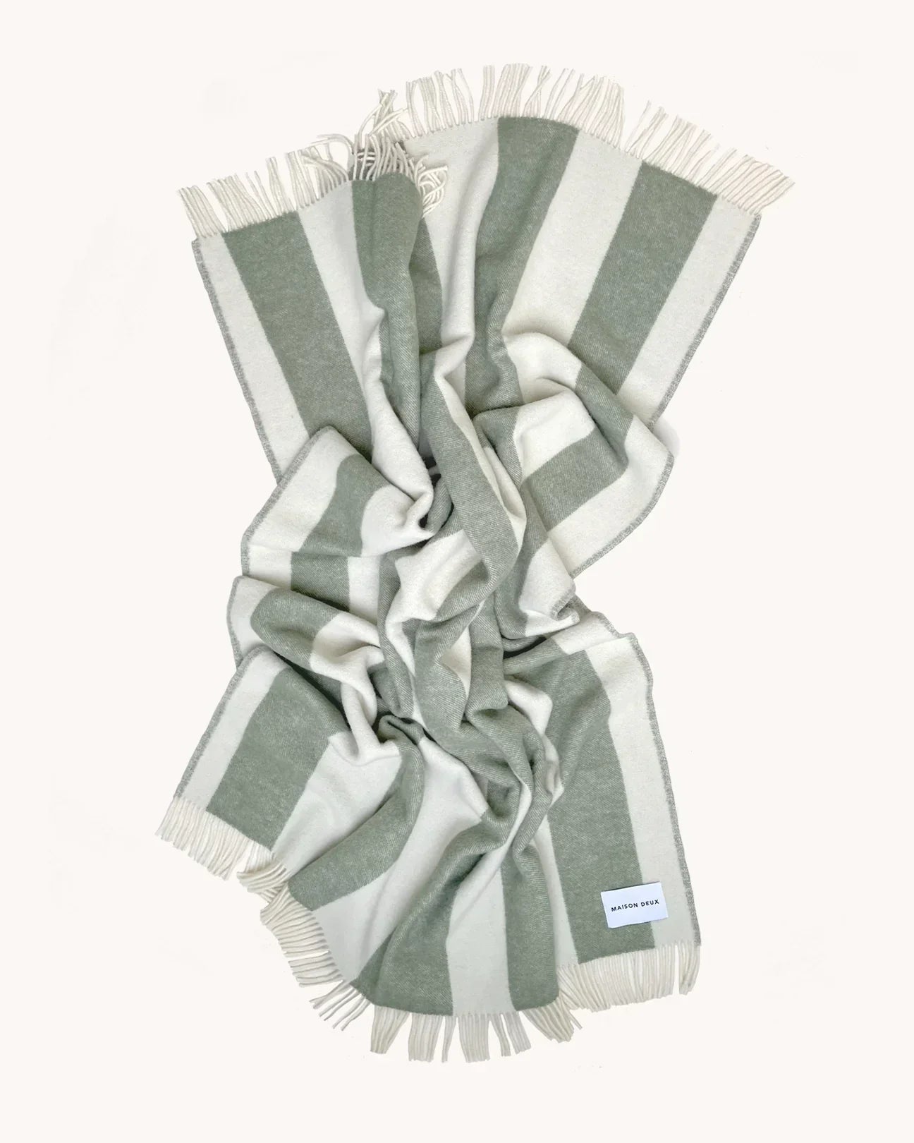 The Rough Stripe Blanket Agave is jacquard-woven from 100% New Zealand wool with fringes on the short sides. A thick premium blanket that is mirror-inverted on the opposite side. Measuring 130 x 200 cm, it's big enough to let someone join you. It keeps you warm and upgrades your living room in a split second.