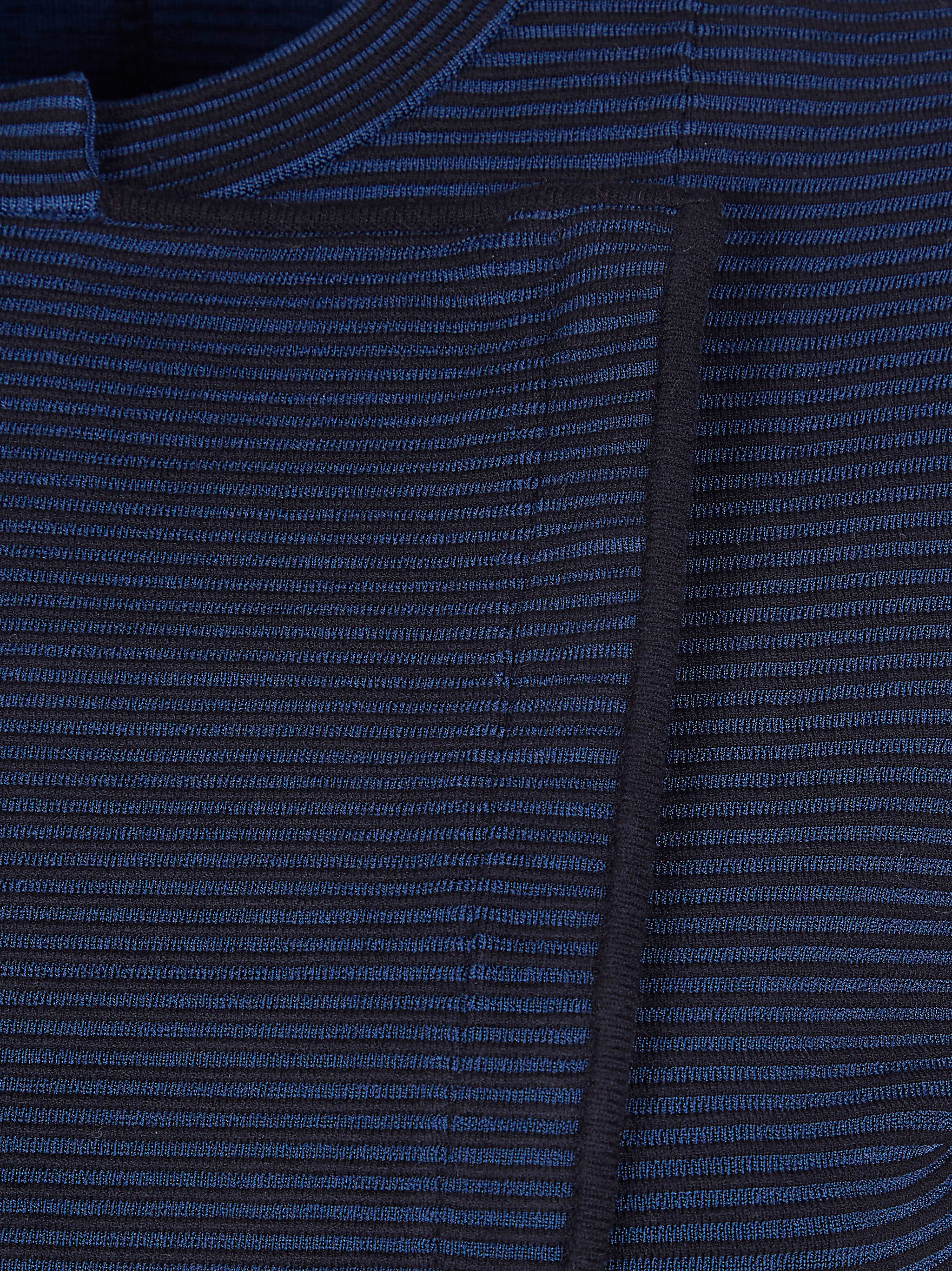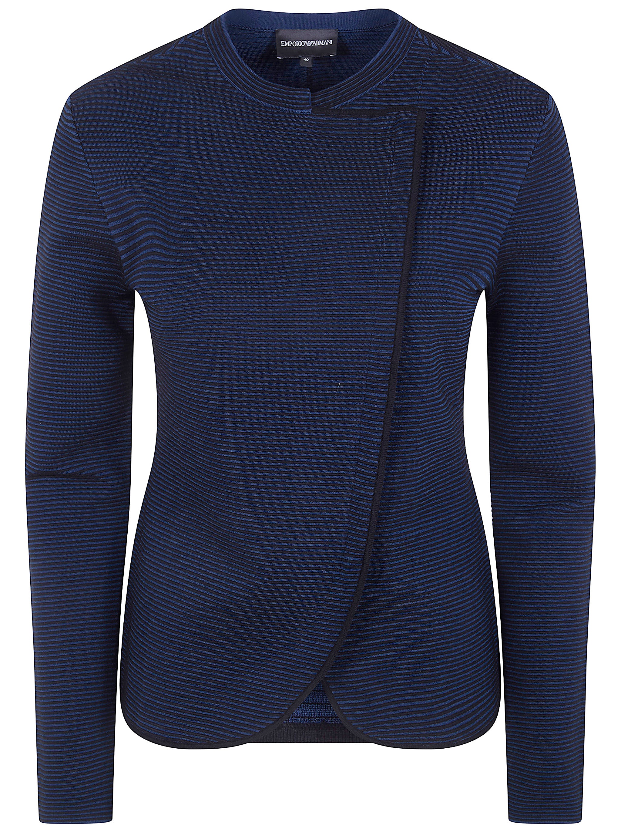 Elevate your everyday wardrobe with this sophisticated striped top from Emporio Armani. Featuring a modern asymmetrical crossover design and refined horizontal stripes in rich navy tones, this long-sleeve piece effortlessly blends structured elegance with comfortable wearability.