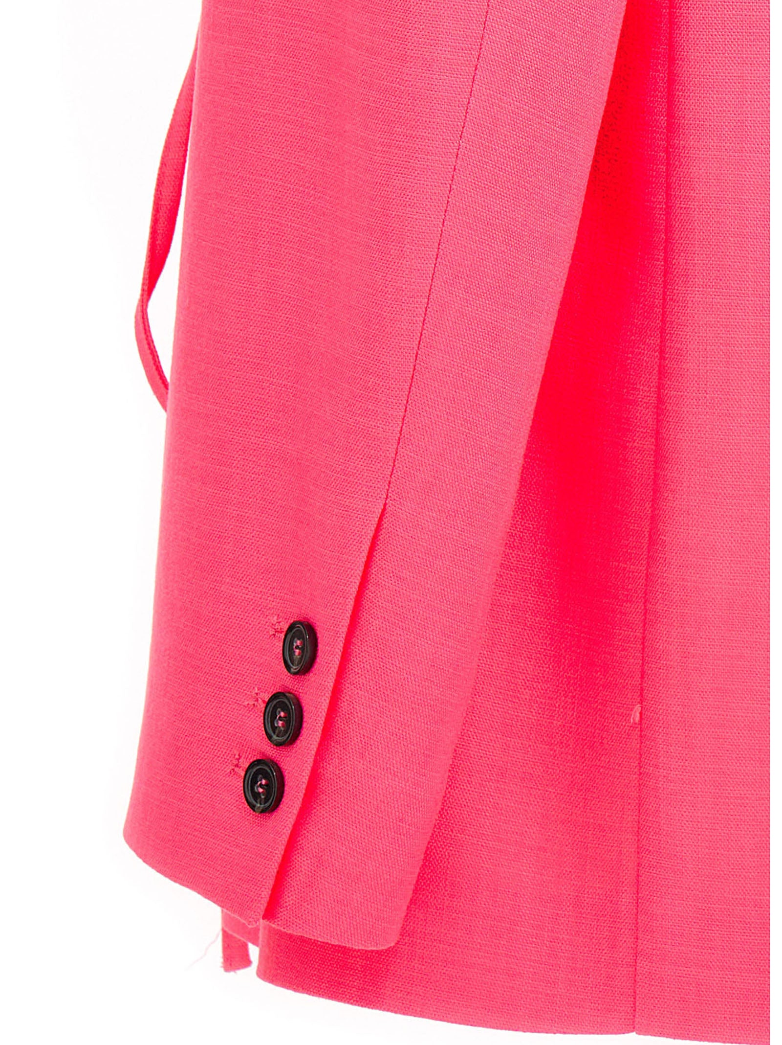 The classic notch lapels and long sleeves offer timeless elegance, while the bright coral-pink hue adds a modern, playful twist. Functional pockets and a back vent ensure both style and comfort.
