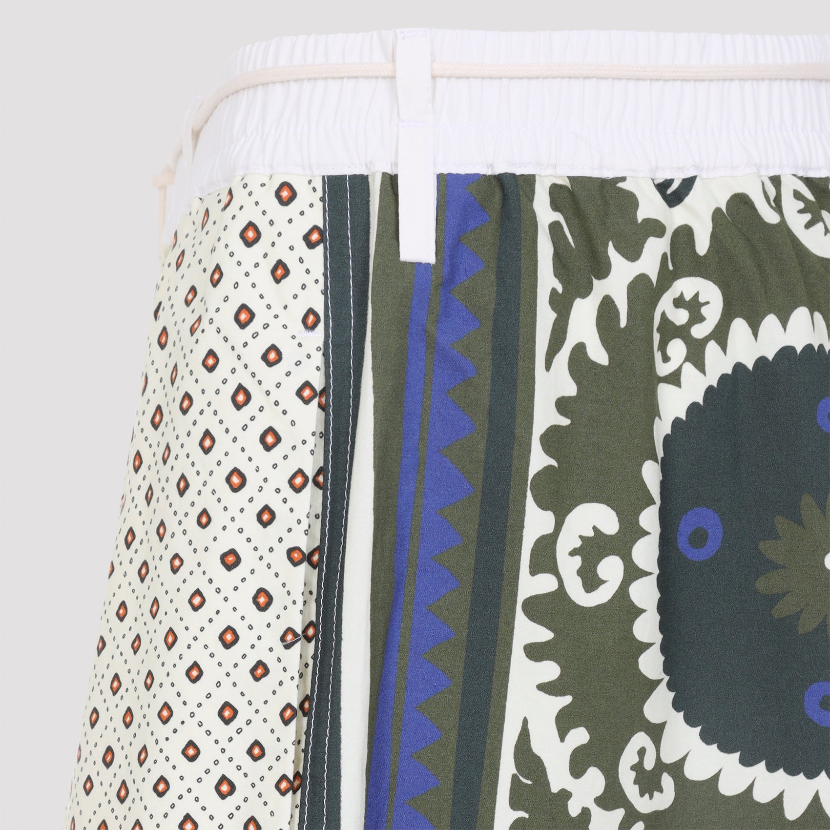 MORDECAI BLUE BANDANA COTTON PAJAMA PANTS. PURE COTTON PANTS, ELASTIC WAIST, TONAL DRAWSTRING FASTENING, BELT LOOPS,WIDE LEGS, STRAIGHT HEM. FRONT AND BACK BLUE, BEIGE AND GREEN GEOMETRIC PATTERN.