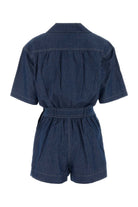 Elevate your warm-weather wardrobe with this stunning Blue Chambray Romper from Prada. This effortlessly chic one-piece features a classic shirt collar, short sleeves, and a flattering belted waist that cinches your silhouette.