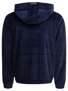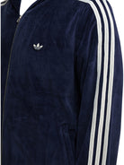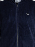 Elevate your athleisure wardrobe with this luxurious Blue Cotton Blend Sweatshirt from adidas Originals. Crafted in a sumptuous velour fabric, this zip-up hoodie features the iconic three-stripe detailing down the sleeves and a classic trefoil logo at the chest.
