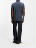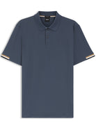 This refined polo features a classic collar, short sleeves with distinctive contrast trim detailing, and a timeless slate blue hue that effortlessly transitions from office to weekend.