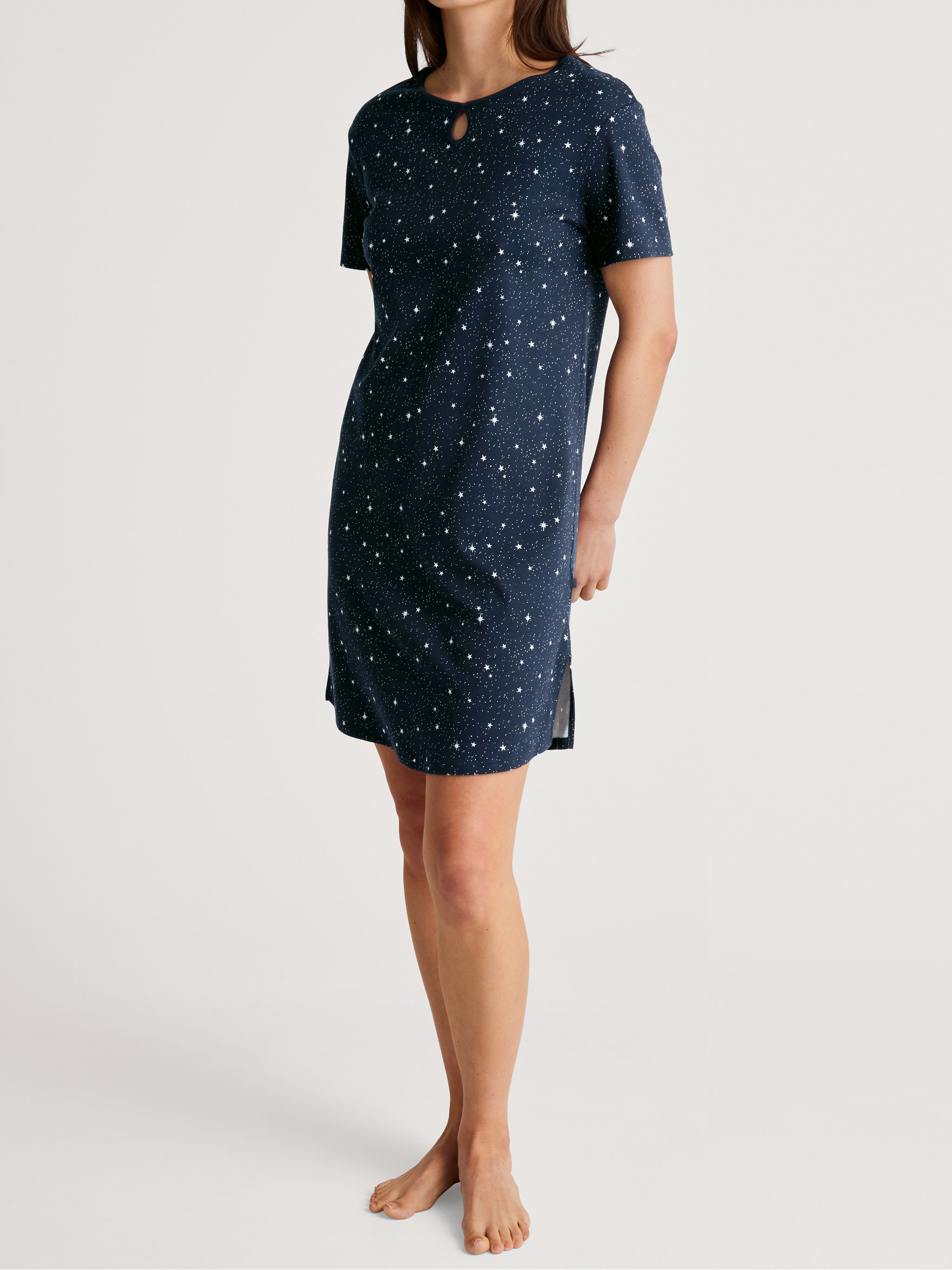 Drift off to dreamland in style with this charming sleepshirt from Calida. Crafted from soft, breathable cotton, this navy blue nightshirt features a delightful scattered star pattern that adds a whimsical touch to your bedtime routine.