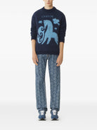 Elevate your knitwear collection with this stunning Blue Mohair Horse Jacquard Sweater from Lanvin. Crafted from a luxurious mohair blend (65% mohair, 32% polyamide, 3% wool), this pullover features an enchanting light blue horse and star jacquard pattern against a rich navy background.
