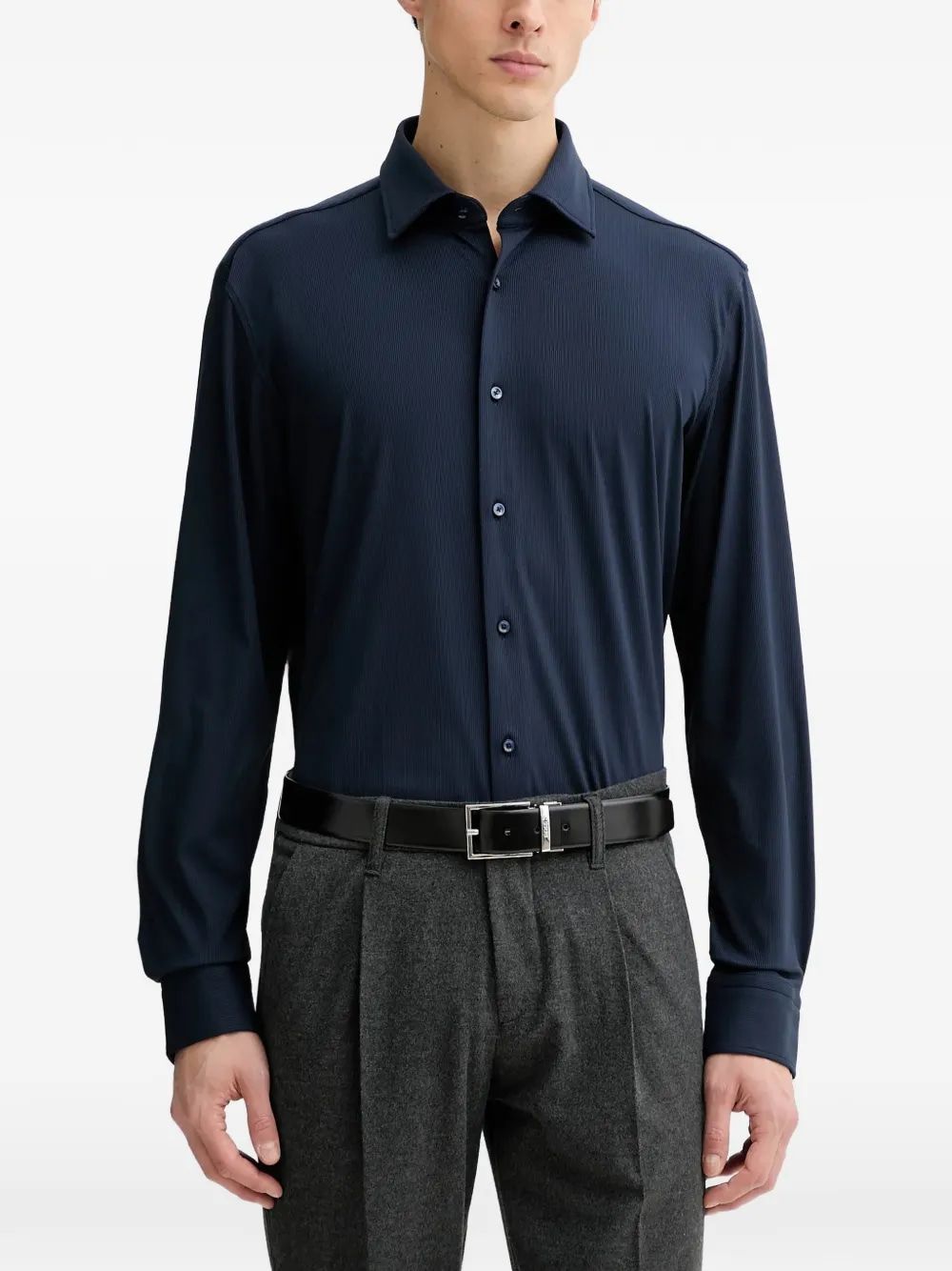 The classic shirt collar and sleek navy blue tone make this piece incredibly versatile—pair it with tailored trousers for the office, or dress it down with chinos for a polished weekend look. The innovative polyamide construction ensures easy care and lasting durability, making it an essential addition to any discerning man's closet.