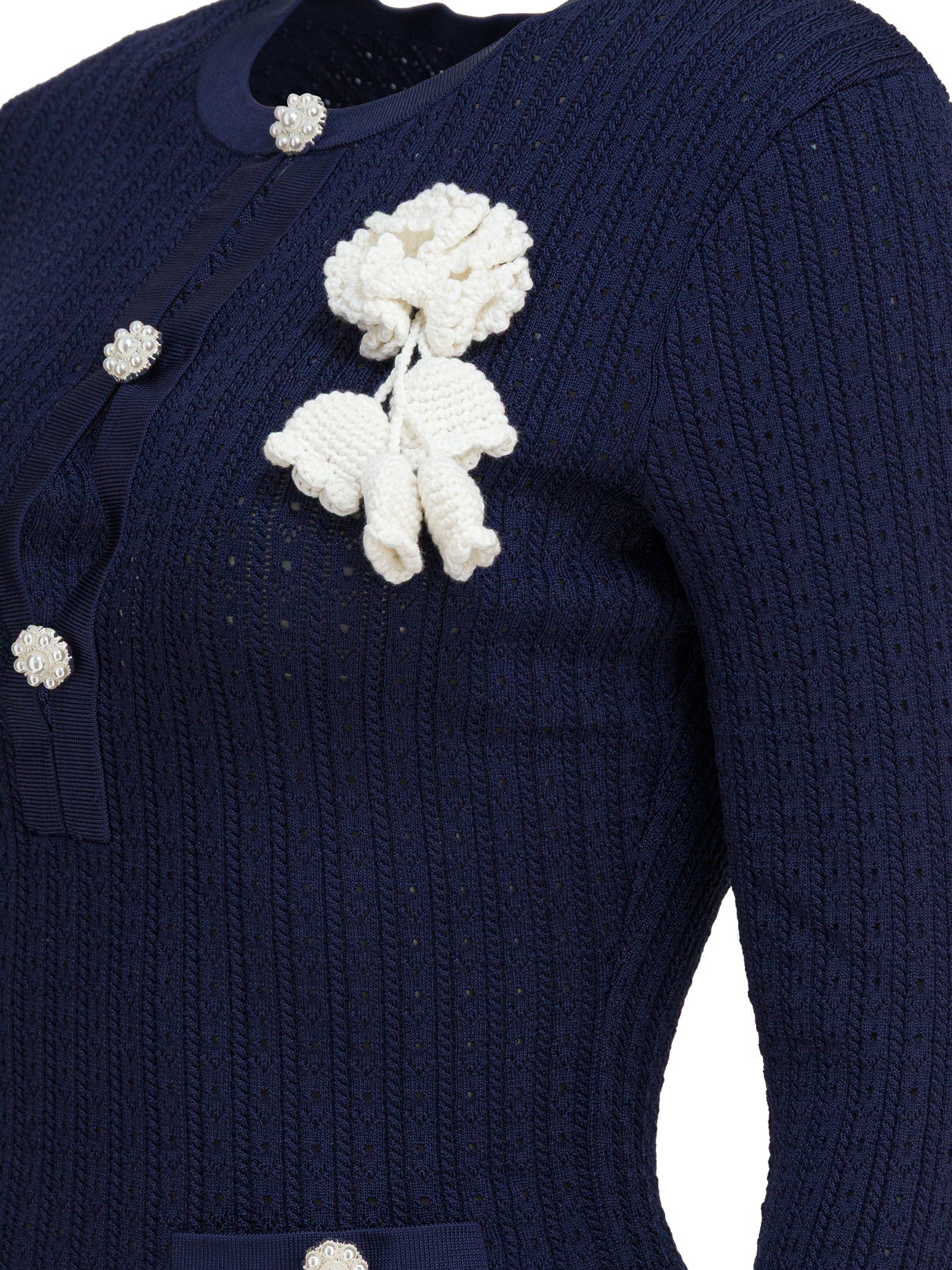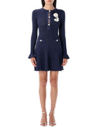 The dress is adorned with exquisite white floral embellishments at the chest, adding a touch of feminine charm and designer detail. Long sleeves with delicate ruffle cuffs and decorative button accents at the waist create a polished, refined aesthetic.