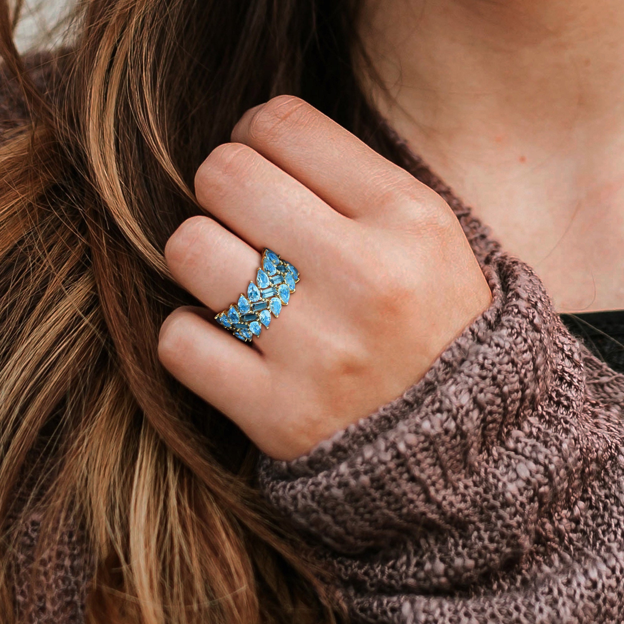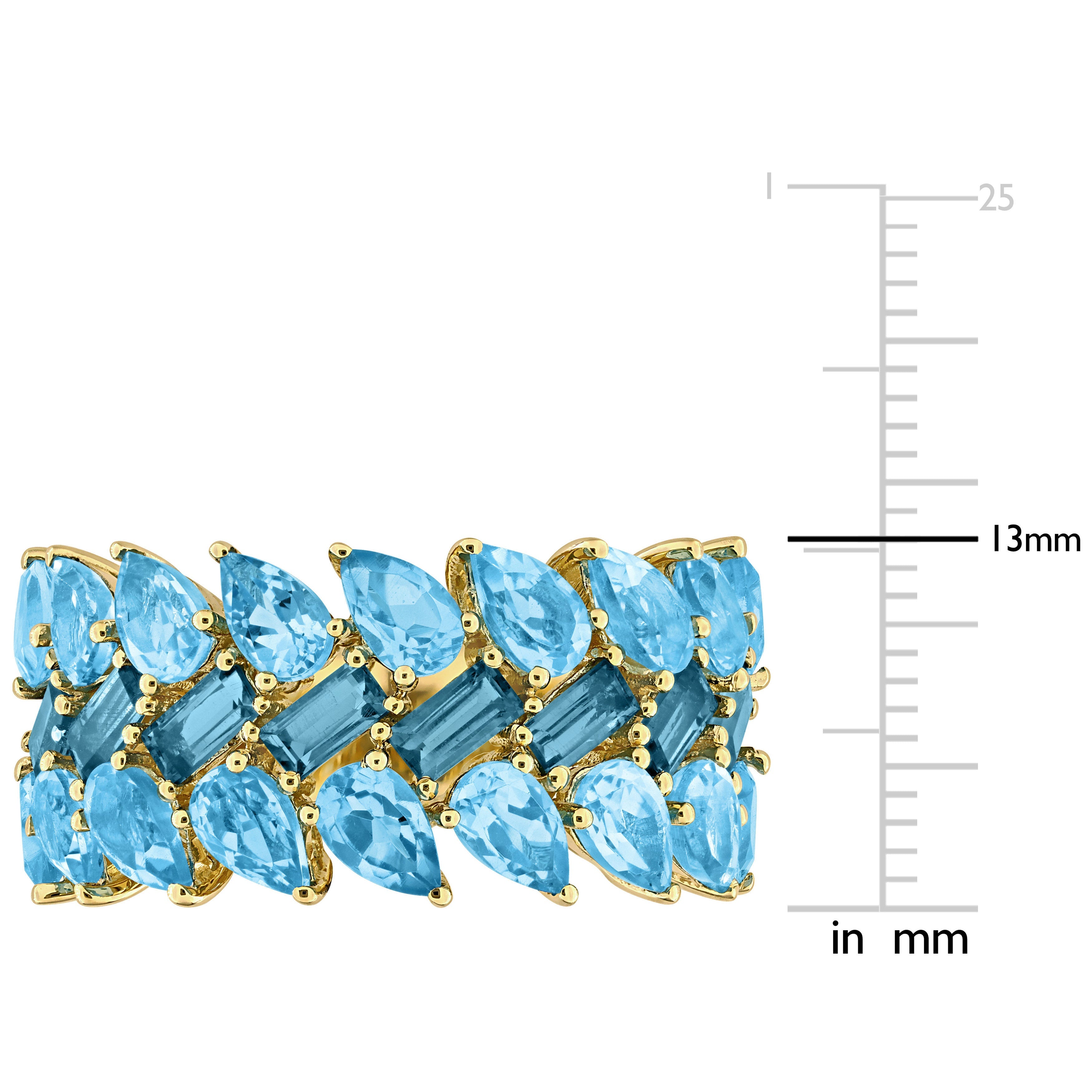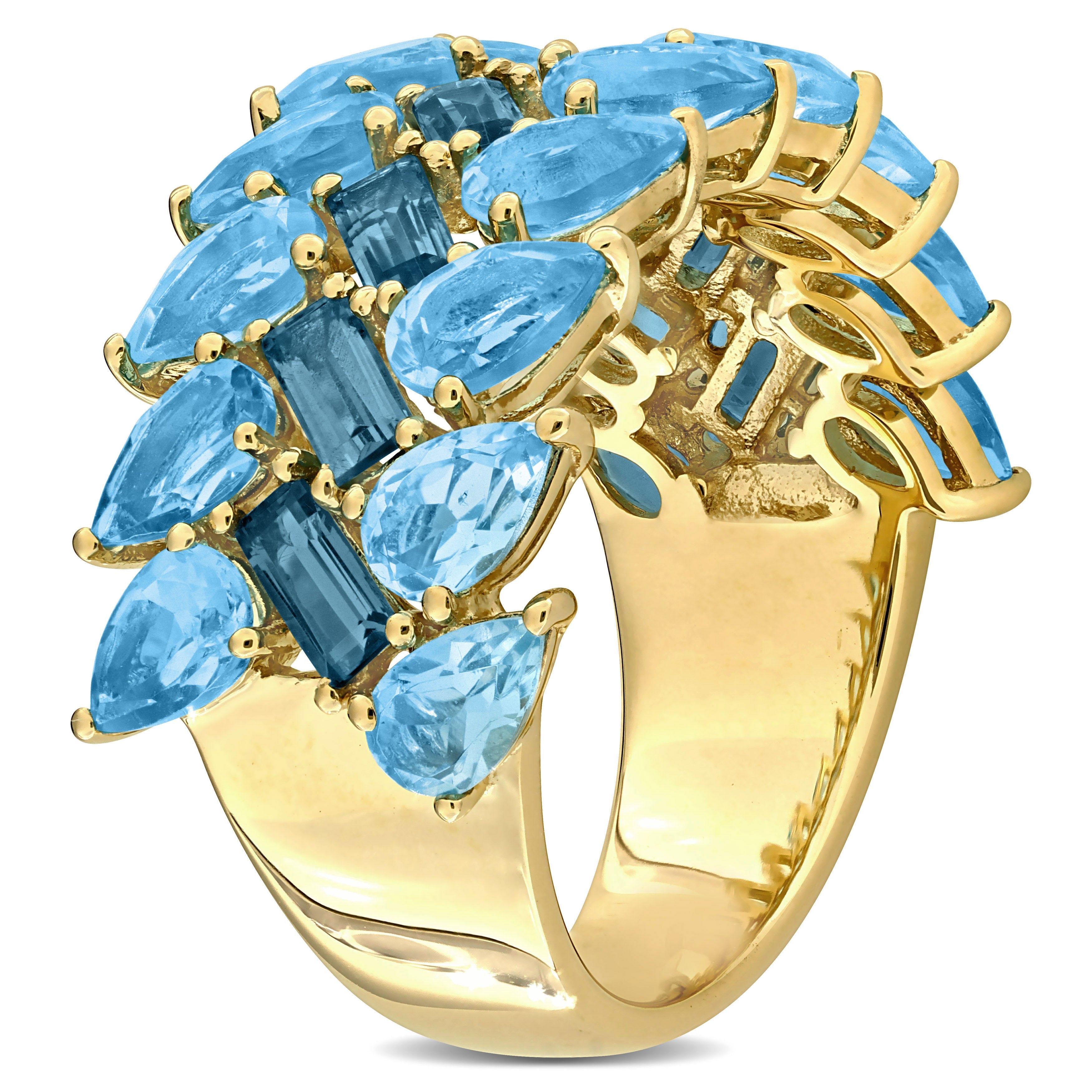 This striking wide band ring in 10k yellow gold showcases a lavish arrangement of baguette-cut London-blue topaz and pear-shaped Swiss blue topaz gemstones. The three-row design is masterfully created to display the vivid blues in a harmonious and dynamic pattern. The richness of the yellow gold perfectly complements the deep and vibrant blue hues of the topaz, enhancing their natural beauty. This exquisite ring is an eye-catching piece, ideal for making a bold statement.