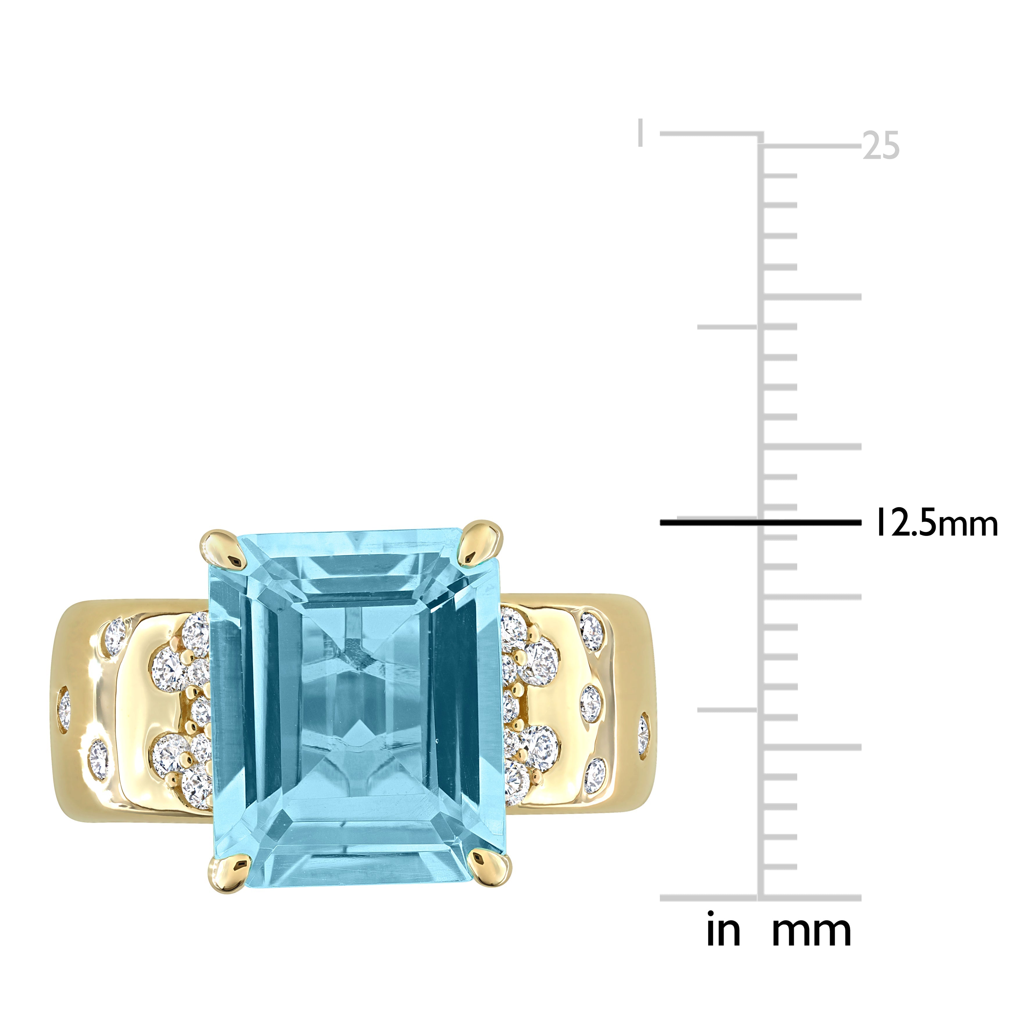 Vivid and elegant, this blue topaz ring features a striking octagon cut center stone embraced in a sleek 4-prong setting. Scattered round cut, flush-set diamonds add brilliant sparkle along the 14K yellow gold band. A unique and colorful piece that radiates sophistication.