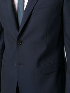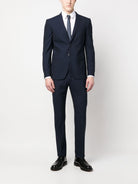 BLUE VIRGIN WOOL TWO-PIECE SUIT. SINGLE-BREASTED JACKET WITH PEAKED LAPELS, FRONT TWO-BUTTON CLOSURE, TWO FRONT FLAP POCKETS, A WELT POCKET ON CHEST AND BUTTONED CUFFS. STRAIGHT-LEG TROUSERS WITH ZIP AND HOOK-AND-EYE CLOSURE, TWO SIDE WELT POCKETS AND TWO REAR WELT POCKETS.