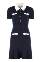 Self-Portrait presents this sophisticated navy blue wool-blend knit dress that effortlessly combines preppy charm with modern elegance. Crafted from a luxurious blend of polyamide, viscose, wool, and alpaca, this ribbed knit dress features crisp white contrast detailing at the collar, chest pockets, and hip pockets for a polished, nautical-inspired aesthetic.