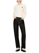 Crafted from a premium blend of 85% cotton and 15% wool, this cream-colored sweater features intricate cable knit detailing and a charming embroidered flower accent at the chest. The relaxed fit and classic crew neckline make it perfect for effortless layering, while the ribbed cuffs and hem provide a polished finish.