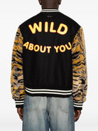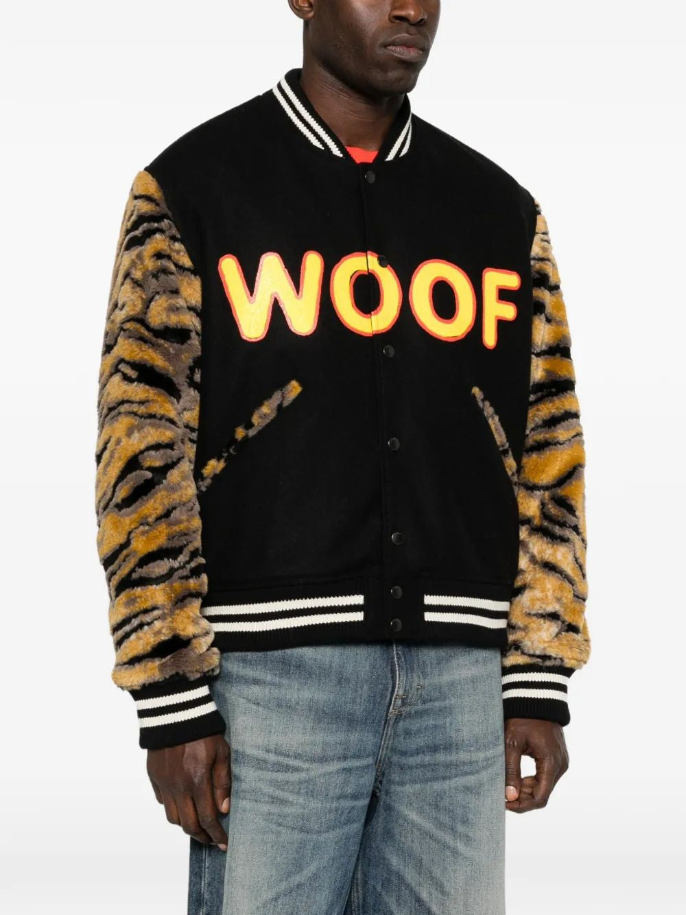 Make a bold statement with this striking Kenzo Bomber Jacket featuring playful "WOOF" lettering and eye-catching tiger-striped sleeves. This varsity-inspired piece combines classic bomber styling with Kenzo's signature artistic flair, featuring a black wool body, contrast striped ribbing, and button-front closure.