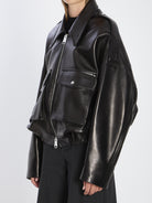 BOMBER IN LIGHTWEIGHT BLACK PLONGé LEATHER. FEATURES DROPPED SHOULDERS, SHOULDER BUTTONS, POINTED COLLAR, FRONT ZIP CLOSURE, TWO VERTICAL FLAP POCKETS WITH SNAP BUTTONS ON THE FRONT, AND GATHERED HEM WITH A BAND. REGULAR FIT.
