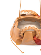 This beautifully structured handbag features premium leather in a warm tan hue, complemented by intricately braided handles and charming foulard accents in vibrant yellow and red tones. The dome-shaped silhouette offers a sophisticated yet playful aesthetic, while the detachable shoulder strap provides versatile carrying options.