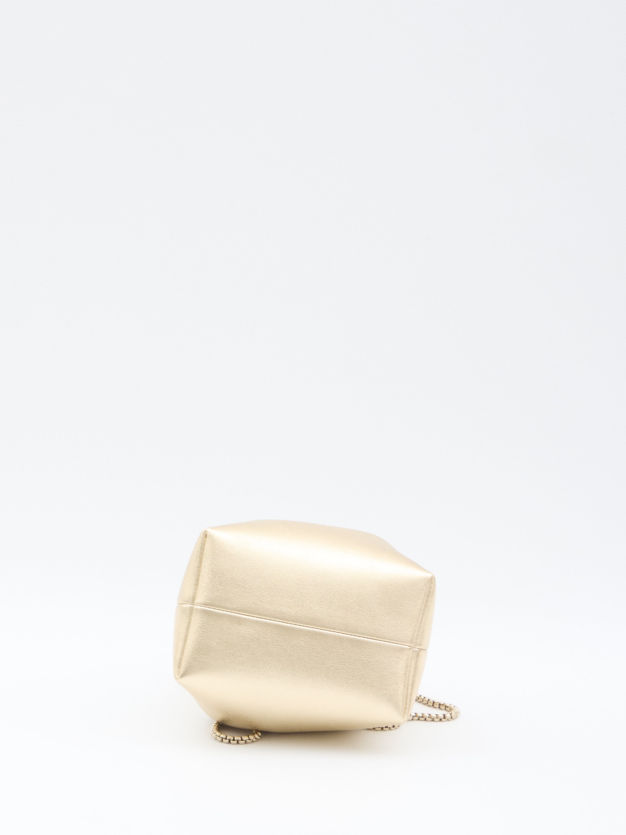Introducing the Bon Bon by Jimmy Choo, a luxurious bucket bag that effortlessly combines elegance with contemporary style. Crafted in a stunning metallic gold finish, this sophisticated piece features a drawstring closure and gleaming chain shoulder strap that adds a touch of glamour to any ensemble. The compact yet spacious silhouette makes it perfect for transitioning from day to evening, whether you're heading to a chic dinner or a night out on the town. This statement accessory embodies Jimmy Choo's signature blend of luxury craftsmanship and modern design. Elevate your handbag collection with this timeless piece that pairs beautifully with both casual and dressed-up looks.