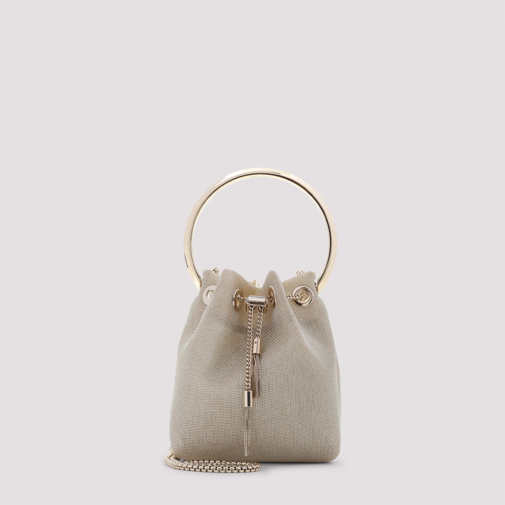 Introducing the Bon Bon Metallic Mesh bag by Jimmy Choo, a stunning statement piece that combines modern elegance with playful sophistication. This exquisite bag features a luxurious metallic mesh construction with a distinctive circular ring handle and drawstring closure adorned with a delicate chain pull.
