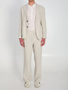 PEARL GRAY HERRINGBONE LINEN BLEND JACKET. FEATURES A CLASSIC LAPEL, A SINGLE-BREASTED CLOSURE WITH TWO BUTTONS, LONG SLEEVES, BUTTON CUFFS, TWO PATCH POCKETS ON THE FRONT, AND TWO BACK VENTS. REGULAR FIT.