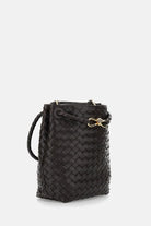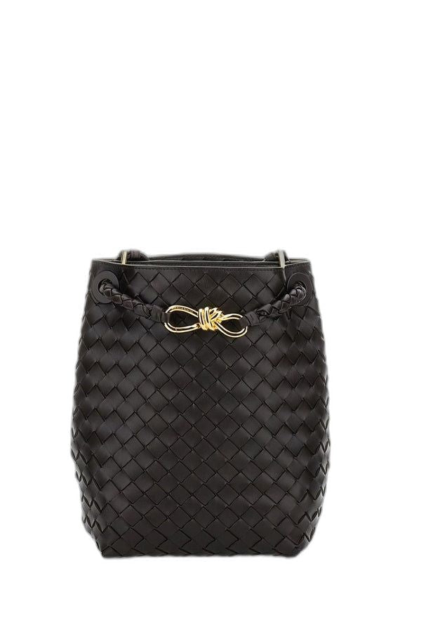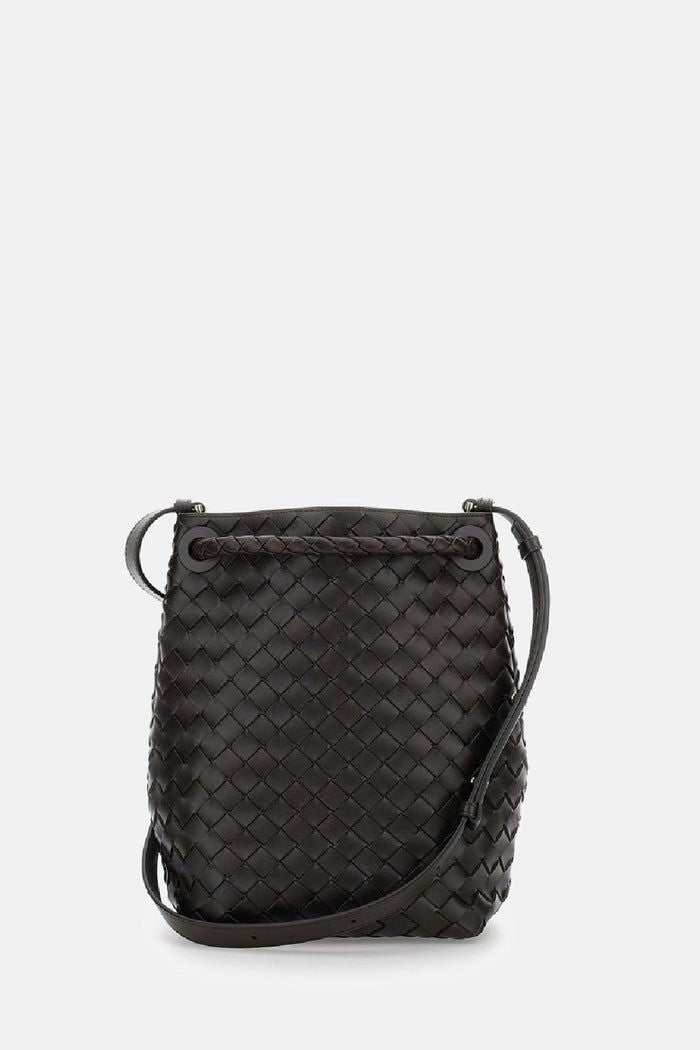 This sophisticated black leather bag showcases impeccable Italian artisanship with its signature woven pattern and elegant bucket silhouette. The top handles and gold-tone hardware closure add both functionality and luxury appeal.