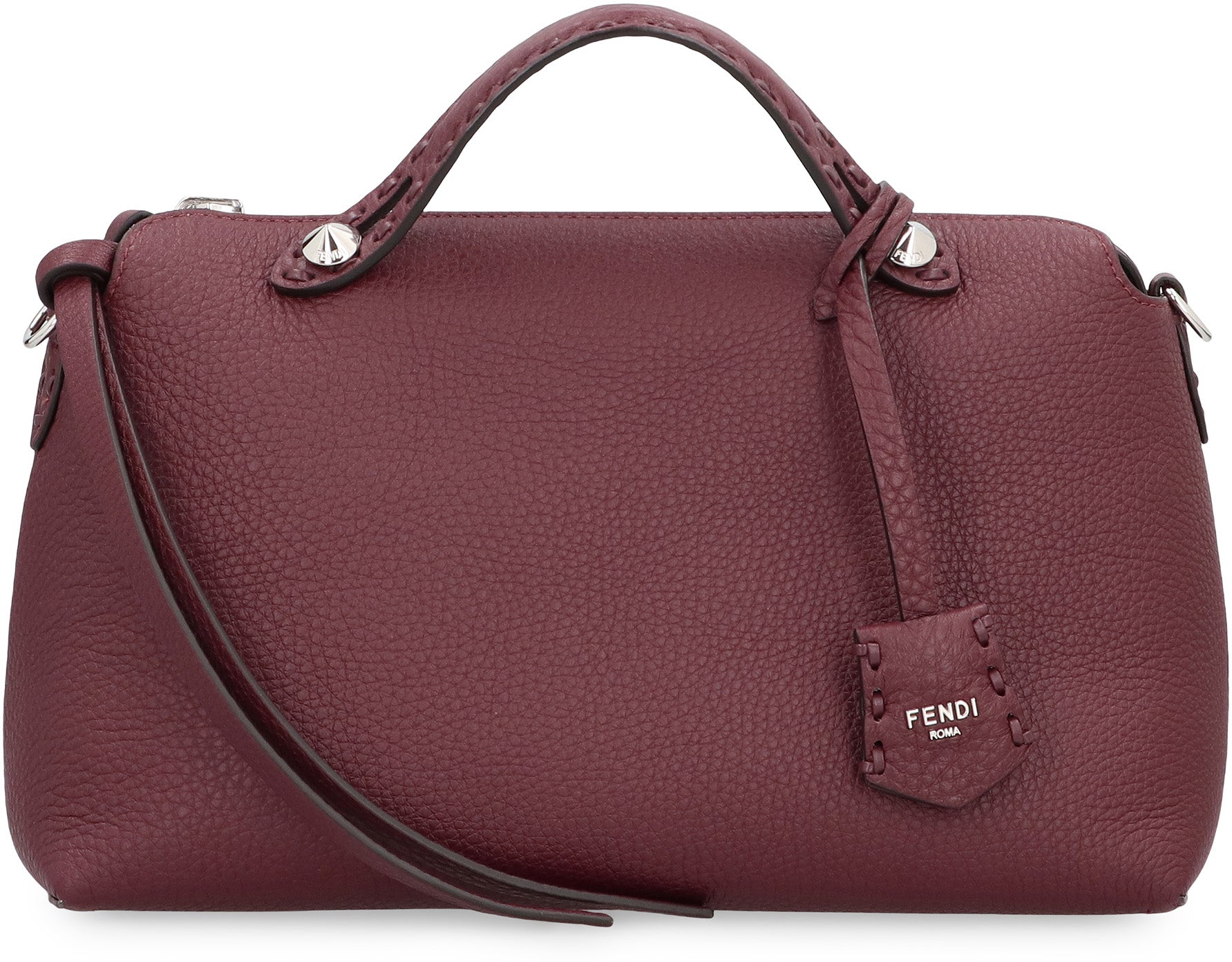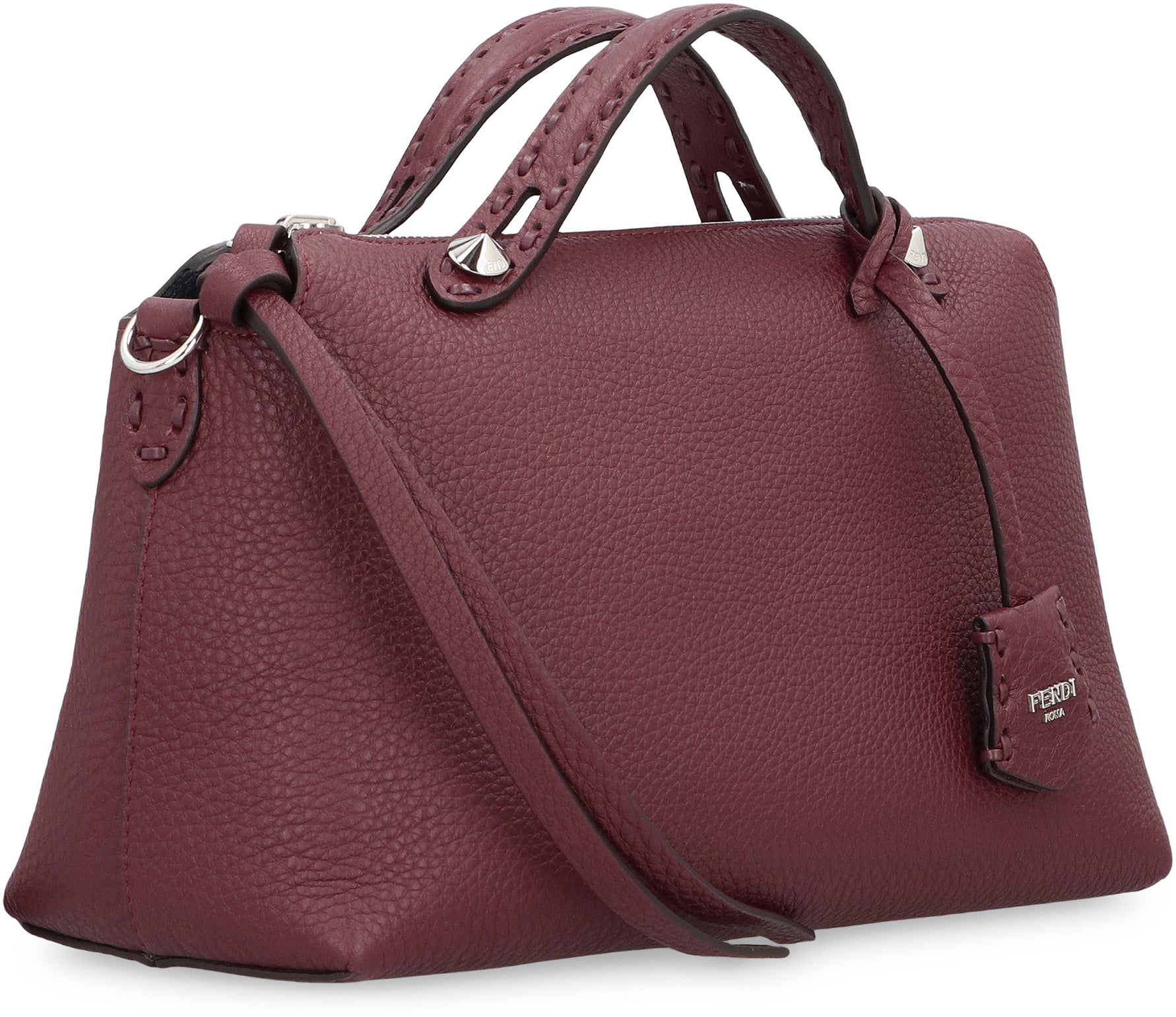 WITH A REVERSIBLE DESIGN, IT IS MADE OF ROMAN LEATHER, CALFSKIN WITH CHARACTERISTIC NATURAL GRAIN. ONE SIDE IS BORDEAUX, THE OTHER MERCURY BLUE. METALLIC ACCESSORIES WITH PALLADIUM FINISH. SELLERIA PENDANT IN ROMAN LEATHER HAND-STITCHED, CUSTOMIZABLE PENDANT AND LONG TIRALAMPO WITH A BORDEAUX KNOT. IT CAN BE CARRIED BY HAND, ON THE SHOULDER, OR CROSS-BODY THANKS TO THE HANDLES AND THE ADJUSTABLE AND REMOVABLE SHOULDER STRAP TO BE TIED.