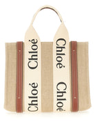 Introducing the Chloé Borsa Tote Woody Small, a chic and versatile everyday companion crafted from 100% linen for effortless style. This compact tote features the iconic Chloé logo prominently displayed on natural canvas with contrasting striped details and elegant cream leather handles.