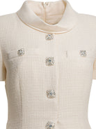 Self-portrait boucle midi dress with pleated skirt, constructed with an overlay of boucle fabric and fluid-effect pleated chiffon inserts. It features a fitted silhouette with minimal stretch, defined by a structured bodice and flared skirt. A structured high neck and concealed back zipper closure complete the construction. Diamond button embellishments at the front add functional and visual detail.