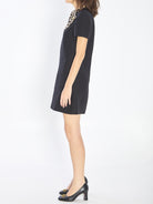Midi dress in black virgin wool and silk crepe couture. Features a leopard-print bow with heart details, back zip closure, short sleeves, and two open front pockets. Silk lining. Regular fit.