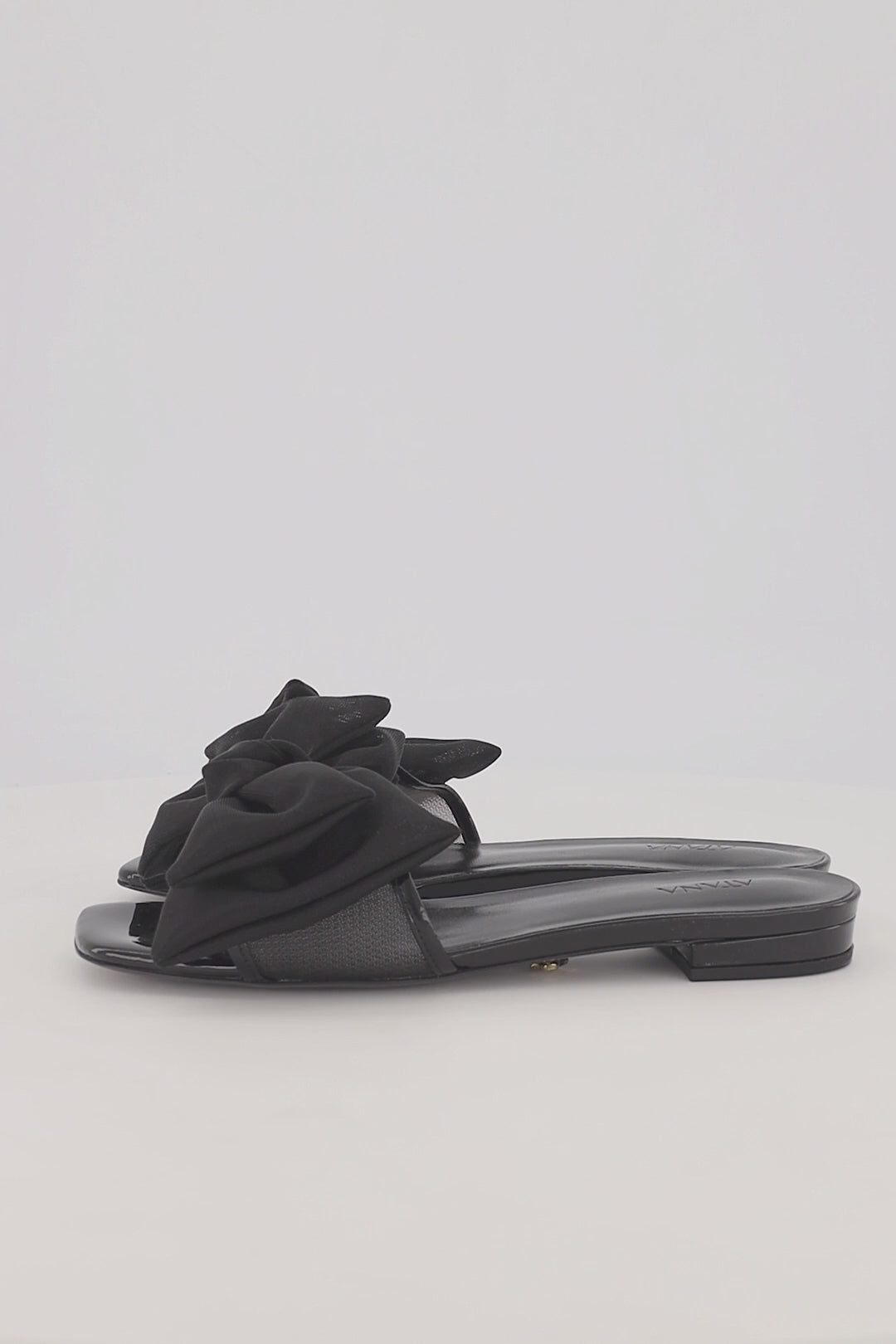 ATANA's bow slide is a flat slipper made in fine Italian leather and mesh. The statement bow was developed in supple and soft mesh and its rich 3D design can be dressed up or down to deliver a striking look while striding in comfort.